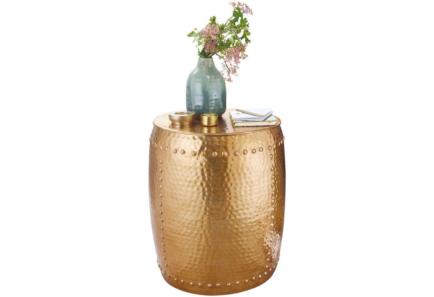 DesignAußergewöhnlicher Dekotisch im orientalischen DesignAblagefläche bietet Platz für z. B. Dekoration, Blumen &amp, Co.Wunderschöne Hammerschlag-Strukturen machen den Tisch zu einem absoluten HighlightIn Linien angeordnete Erhöhungen (Nietenform) runden das Design des Ablagetisches gekonnt abAbmessungenBreite: 42 cmHöhe: 49 cmTiefe: 42 cmDurchmesser der Ablagefläche: 38,5 cmDurchmesser der Standfläche: 38,5 cmFarbeKompletter Tisch: GoldfarbenBesonderheitenEmpfohlene max. Belastbarkeit: 15 kgDurch liebevolle Handarbeit ist jeder Beistelltisch ein absolutes UnikatDa die Unterkante nach innen gefalzt ist, sind scharfe Kanten vermieden wordenHohe Stabilität durch das hochwertig verarbeitete Aluminium und die runde FormAufgrund der Handarbeit machen einzelne kleine Dellen die Dekotische zu absoluten EinzelstückenMaterialKompletter Beistelltisch: AluminiumPflegehinweiseDie Oberfläche mit einem lauwarm angefeuchteten Baumwolltuch reinigen. Bitte keine harten Bürsten oder Metallschwämme verwenden, da diese Kratzer im Metall verursachen. Keine Scheuermittel, scharfen Reinigungsmittel oder tropfnassen Tücher verwenden.LieferumfangEin Beistelltisch ohne DekorationMontageLieferzustand: Montiert und sicher verpackt