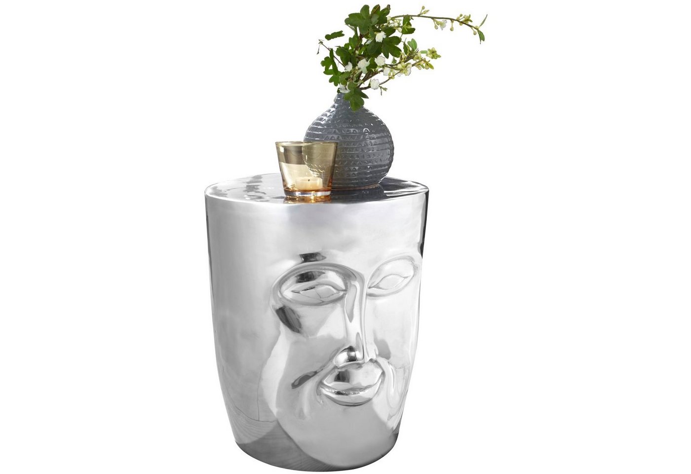 DesignExtravaganter Beistelltisch mit einem 3D-GesichtAblagefläche bietet Platz für z. B. Fernbedienung, Zeitschriften &, Co.Glänzende Oberflächen rundes das Design gekonnt abAbmessungenBreite: 32,5 cmHöhe: 39 cmTiefe: 35 cmFarbeKompletter Dekotisch: SilbernBesonderheitenEmpfohlene max. Belastbarkeit: 15 kgDurch liebevolle Handarbeit ist jeder Tisch ein absolutes UnikatDa die Unterkante nach innen gefalzt ist, sind scharfe Kanten vermieden wordenHohe Stabilität durch das hochwertig verarbeitete AluminiumMaterialKompletter Anstelltisch: AluminiumPflegehinweiseDie Oberfläche mit einem lauwarm angefeuchteten Baumwolltuch reinigen. Bitte keine harten Bürsten oder Metallschwämme verwenden, da diese Kratzer im Metall verursachen. Keine Scheuermittel, scharfen Reinigungsmittel oder tropfnassen Tücher verwenden.LieferumfangEin Couchtisch ohne DekorationMontageLieferzustand: Montiert und sicher verpackt