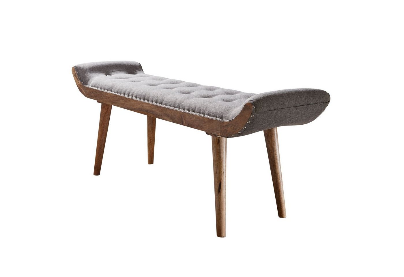 DesignStylische Stoffsitzbank in modernem DesignStimmiger Materialmix aus Massivholz und StoffÜppige Polsterung für ein angenehmes SitzgefühlWunderschönes Chesterfield-Muster auf der SitzoberflächeEleganter Nietenrand führt um die Sitzfläche herumAbmessungenBreite: 125 cmHöhe: 51 cmTiefe: 38 cmHöhe der Sitzfläche (Holz und Stoff): 10 cmSitzhöhe: 46,5 cmAbstand Boden bis Bankunterseite: 36,5 cmFarbeSitzfläche: GrauBeine: BraunDas Holz kann farblich vom Bild leicht abweichen, da es sich um ein Naturprodukt handeltBesonderheitenFester und stabiler Stand dank der robusten MassivholzbeineSehr weiche Polsterung sorgt für ein angenehmes SitzgefühlHochwertiger &, strapazierfähiger Sitzbezug aus StoffAnti-Rutsch-Noppen an den Fußenden schützen Ihren Fußboden vor KratzernIn liebevoller Handarbeit gefertigt – daher ist jedes Stück ein UnikatEmpfohlene Maximalbelastbarkeit: 200 kgMaterialSitzflächenbezug: StoffBeine: Mango MassivholzNieten: MetallTextilzusammensetzungSitzflächenbezug: 100% PolyesterLieferumfangEine Stoffbank ohne DekorationMontageanleitung und -material liegen der Lieferung beiMontageLieferzustand: teilmontiert – lediglich die Beine müssen angebracht werdenPflegehinweiseDie Oberfläche des Holzes mit einem lauwarm angefeuchteten Baumwolltuch reinigen. Empfehlung für den Stoff: einen milden Polsterreiniger verwenden, um Flecken zu entfernen. Keine Scheuermittel, scharfen Reinigungsmittel oder tropfnassen Tücher verwenden.