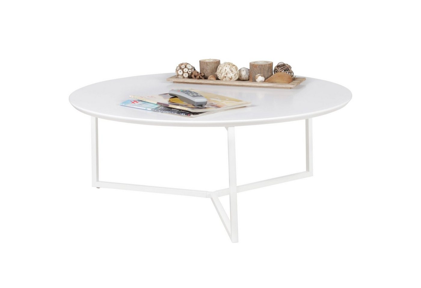 DesignCouchtisch in zeitlosem, modernem Design Eine runde großzügige TischplatteWeißes Metall-BeingestellAbmessungenGesamthöhe: 33 cmDurchmesser Tischplatte: Ø 80 cmFarbeKompletter Tisch: Weiß (matt)BesonderheitenEmpfohlene max. Belastbarkeit: 10 kgSehr standsicher durch die Verstrebung der BeinePflegeleicht durch die lackierte OberflächeMaterialBeine: Stahl (lackiert)Tischplatte: MDF-HolzPflegehinweiseMit feuchtem Tuch, evtl. mit mildem Reinigungsmittel abwischen, mit trockenem Tuch nachwischen. Keine scharfen oder lösungsmittelhaltigen Reiniger verwenden.LieferumfangEin Couchtisch ohne Dekoration // Montageanleitung und Montagematerial inklusiveMontageLieferzustand: demontiert und sicher verpackt