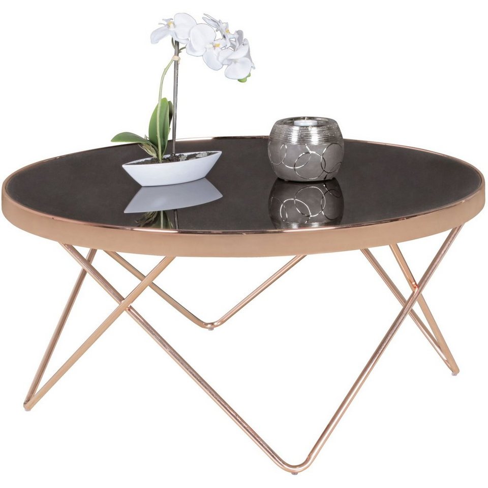 DesignEleganter Couchtisch im Retro-DesignFiligrane, V-förmige Tischbeine Charmante Farbgebung AbmessungenHöhe: 40 cmDurchmesser Tischplatte: 82 cmFarbeGlasplatte: SchwarzGestell: KupferfarbenBesonderheitenEmpfohlene max. Belastbarkeit: 10 kgÜberkreuztes Vierbeingestell für einen sicheren StandGroßzügige und runde Tischplatte Anti-Rutsch-Noppen schützen Ihren Boden vor unschönen Kratzern und SchlierenDie metallenen Bauteile sind mit einer Schutzfolie überzogen – die Folie bitte nach der Montage entfernenMaterialKorpus: Stahl (lackiert)Tischplatte: Einscheiben-SicherheitsglasPflegehinweiseOberfläche mit einem lauwarm angefeuchteten Baumwolltuch abwischen. Scheuermittel und scharfe Reiniger unbedingt vermeiden und die Restfeuchtigkeit mit einem fusselfreiem Lappen entfernen.LieferumfangEin Couchtisch ohne Dekoration // Montageanleitung und Montagematerial inklusiveMontageLieferzustand: Zerlegt und praktisch verpackt // Leicht verständliche Montageanleitung inklusive // Einfacher und schneller Aufbau dank gut durchdachter Konstruktion