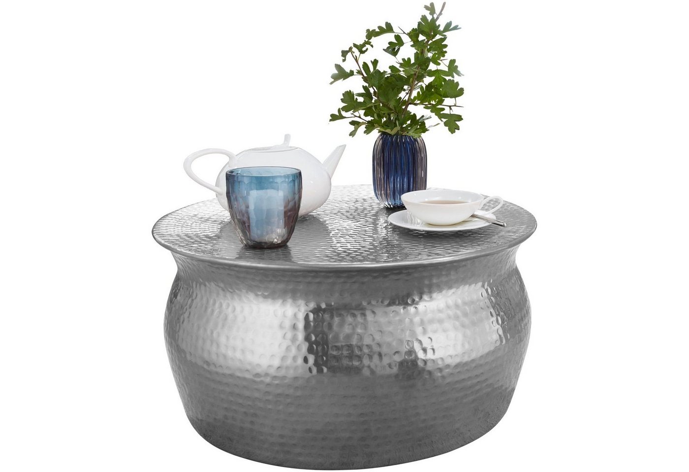 DesignAußergewöhnlicher Couchtisch im orientalischen DesignAblagefläche bietet Platz für z. B. Fernbedienung, Zeitschriften &, Co.Wunderschöne Hammerschlag-Strukturen machen den Tisch zu einem absoluten HighlightAbmessungenBreite: 60 cmHöhe: 30,5 cmTiefe: 60 cmDurchmesser der Ablagefläche: 60 cmDurchmesser der Standfläche: 53 cmFarbeKompletter Tisch: SilberfarbenBesonderheitenEmpfohlene max. Belastbarkeit: 20 kgDurch liebevolle Handarbeit ist jeder Tisch ein absolutes UnikatDa die Unterkante nach innen gefalzt ist, sind scharfe Kanten vermieden wordenHohe Stabilität durch das hochwertig verarbeitete Aluminium und die runde FormAufgrund der Handarbeit machen einzelne kleine Dellen die Tische zu absoluten EinzelstückenMaterialKompletter Tisch: AluminiumPflegehinweiseDie Oberfläche mit einem lauwarm angefeuchteten Baumwolltuch reinigen. Bitte keine harten Bürsten oder Metallschwämme verwenden, da diese Kratzer im Metall verursachen. Keine Scheuermittel, scharfen Reinigungsmittel oder tropfnassen Tücher verwenden.LieferumfangEin Couchtisch ohne DekorationMontageLieferzustand: Montiert und sicher verpackt
