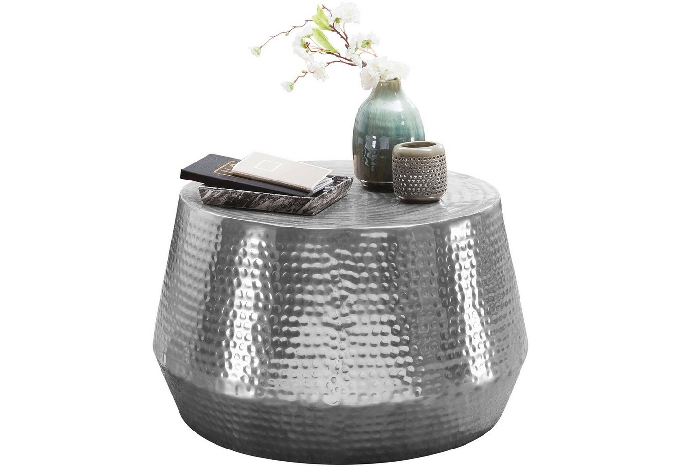 DesignAußergewöhnlicher Couchtisch im orientalischen DesignAblagefläche bietet Platz für z. B. Fernbedienung, Zeitschriften &amp, Co.Wunderschöne Hammerschlag-Strukturen machen den Tisch zu einem absoluten HighlightAbmessungenBreite: 60 cmHöhe: 36 cmTiefe: 60 cmDurchmesser der Ablagefläche: 52 cmDurchmesser der Standfläche: 53,5 cmFarbeKompletter Sofatisch: SilberfarbenBesonderheitenEmpfohlene max. Belastbarkeit: 20 kgDurch liebevolle Handarbeit ist jeder Tisch ein absolutes UnikatDa die Unterkante nach innen gefalzt ist, werden unschöne Kratzer im Boden vermiedenHohe Stabilität durch das hochwertig verarbeitete Aluminium und die runde FormMaterialKompletter Wohnzimmertisch: AluminiumPflegehinweiseDie Oberfläche mit einem lauwarm angefeuchteten Baumwolltuch reinigen. Bitte keine harten Bürsten oder Metallschwämme verwenden, da diese Kratzer im Metall verursachen. Keine Scheuermittel, scharfen Reinigungsmittel oder tropfnassen Tücher verwenden.LieferumfangEin Couchtisch ohne DekorationMontageLieferzustand: Montiert und sicher verpackt