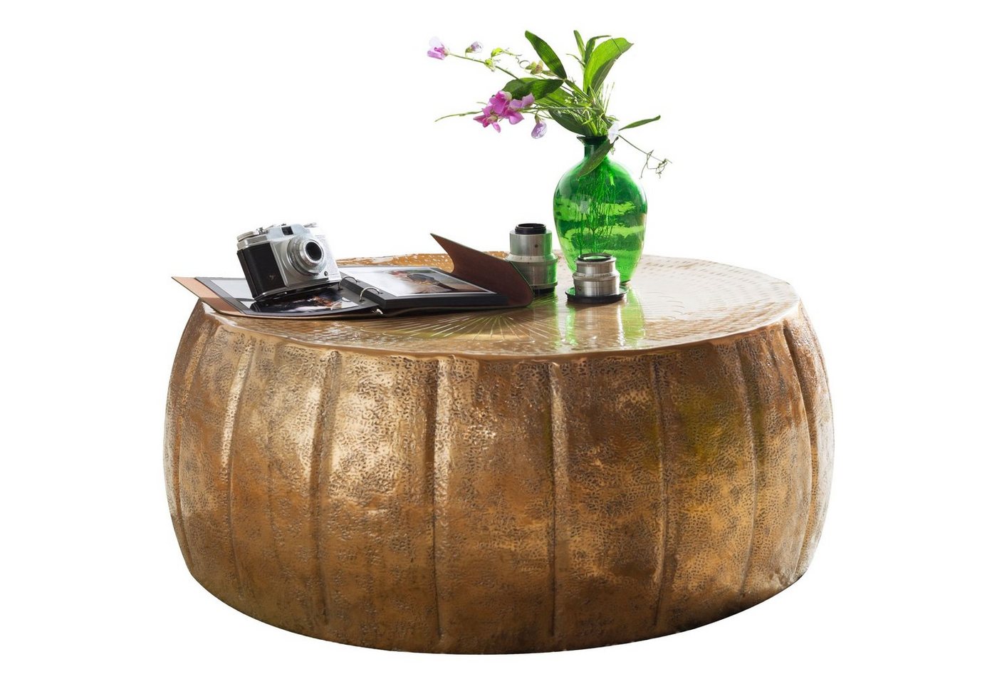 DesignAußergewöhnlicher Couchtisch im orientalischen DesignAblagefläche bietet Platz für z. B. Fernbedienung, Zeitschriften &, Co.Wunderschöne Strukturen machen den Tisch zu einem absoluten HighlightEin formschönes Bildzeichen schmückt die AblageflächeAbmessungenBreite: 72 cmHöhe: 31 cmTiefe: 72 cmDurchmesser der Ablagefläche: 67 cmFarbeKompletter Stubentisch: GoldfarbenBesonderheitenEmpfohlene max. Belastbarkeit: 20 kgDurch liebevolle Handarbeit ist jeder Tisch ein absolutes UnikatDa die Unterkante nach innen gefalzt ist, sind scharfe Kanten vermieden wordenHohe Stabilität durch das hochwertig verarbeitete Aluminium und die runde FormAufgrund der Handarbeit machen einzelne kleine Dellen die Tische zu absoluten EinzelstückenMaterialKompletter Sofatisch: AluminiumPflegehinweiseDie Oberfläche mit einem lauwarm angefeuchteten Baumwolltuch reinigen. Bitte keine harten Bürsten oder Metallschwämme verwenden, da diese Kratzer im Metall verursachen. Keine Scheuermittel, scharfen Reinigungsmittel oder tropfnassen Tücher verwenden.LieferumfangEin Couchtisch ohne DekorationMontageLieferzustand: Montiert und sicher verpackt