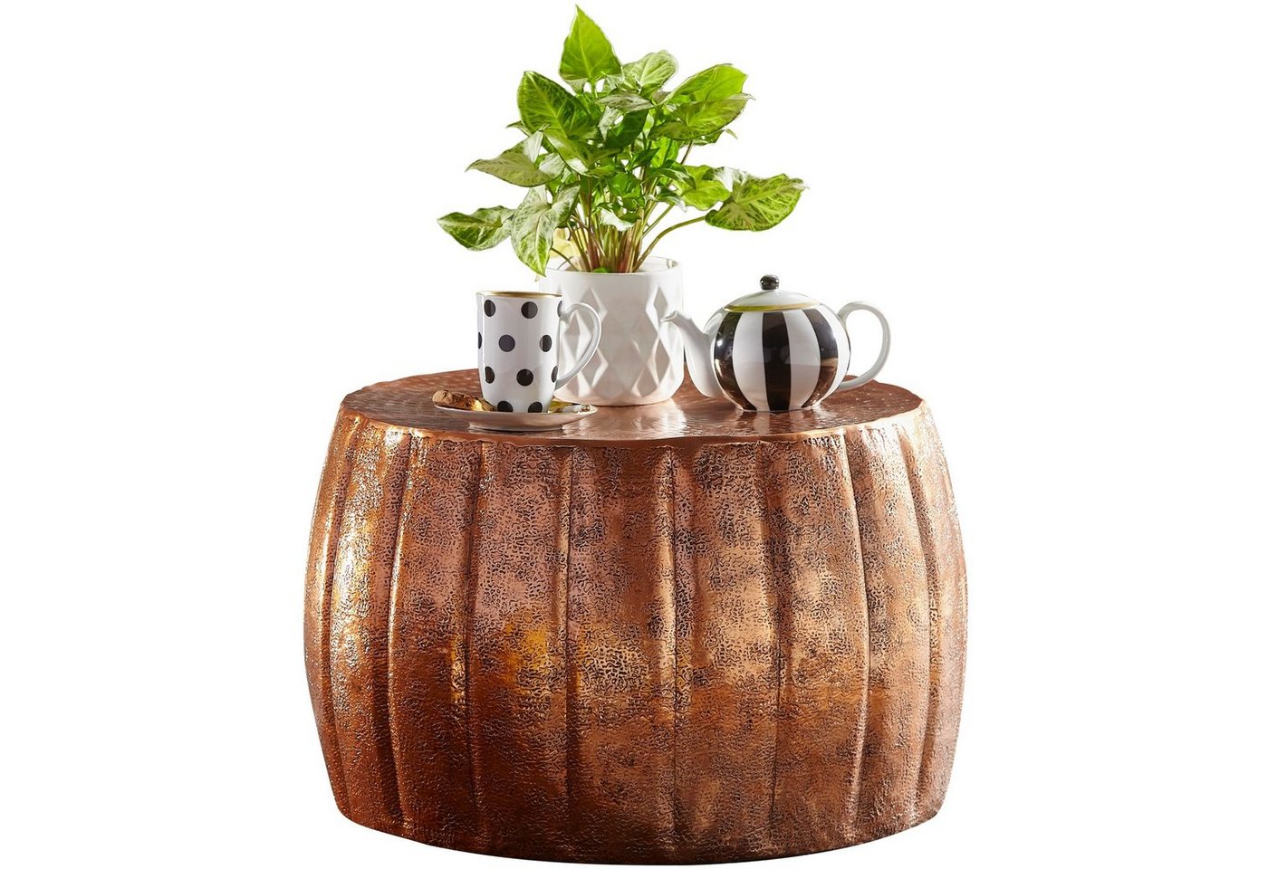 DesignAußergewöhnlicher Couchtisch im orientalischen DesignAblagefläche bietet Platz für z. B. Fernbedienung, Zeitschriften &amp, Co.Wunderschöne Strukturen machen den Tisch zu einem absoluten HighlightEin formschönes Bildzeichen schmückt die AblageflächeAbmessungenBreite: 60 cmHöhe: 36 cmTiefe: 60 cmDurchmesser der Ablagefläche: 52,5 cmFarbeKompletter Stubentisch: KupferfarbenBesonderheitenEmpfohlene max. Belastbarkeit: 20 kgDurch liebevolle Handarbeit ist jeder Tisch ein absolutes UnikatDa die Unterkante nach innen gefalzt ist, sind scharfe Kanten vermieden wordenHohe Stabilität durch das hochwertig verarbeitete Aluminium und die runde FormAufgrund der Handarbeit machen einzelne kleine Dellen die Tische zu absoluten EinzelstückenMaterialKompletter Sofatisch: AluminiumPflegehinweiseDie Oberfläche mit einem lauwarm angefeuchteten Baumwolltuch reinigen. Bitte keine harten Bürsten oder Metallschwämme verwenden, da diese Kratzer im Metall verursachen. Keine Scheuermittel, scharfen Reinigungsmittel oder tropfnassen Tücher verwenden.LieferumfangEin Couchtisch ohne DekorationMontageLieferzustand: Montiert und sicher verpackt