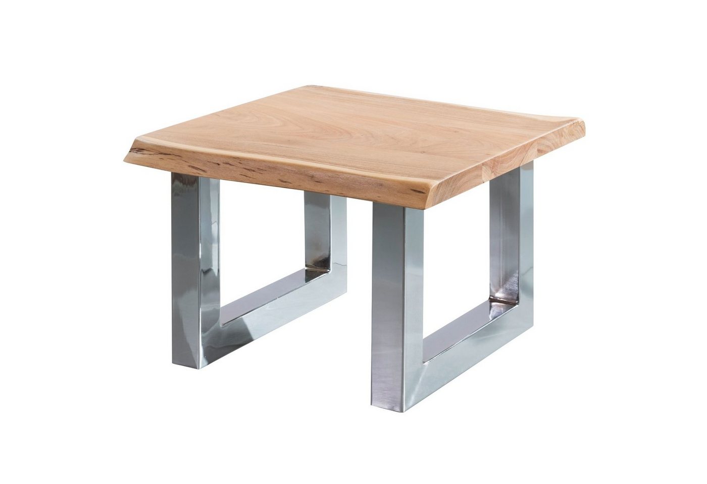 DesignCouchtisch im charakterstarken Landhaus-StilQuadratische Tischplatte zur Ablage von diversen UtensilienBaumkanten an zwei Tischkanten als absoluter HinguckerFester Stand dank der stabilen MetallbeineAbmessungenBreite: 58 cmHöhe: 40 cmTiefe: ca. 60 cmBoden bis Tischunterkante: 36 cmStärke der Tischplatte: 4 cmStärke der Metallbeine (B x T): 6 x 6 cmFarbeTischplatte: BraunBeine: VerchromtBesonderheitenEmpfohlene max. Belastbarkeit: 50 kgJeder Tisch wurde in liebevoller Handarbeit gefertigt – jedes Stück ein absolutes UnikatHolzschutz bietet die Schutzlackversiegelung der OberflächenAnti-Rutsch-Noppen schützen Ihren Fußboden vor KratzernMaterialPlatte: Massivholz AkazieBeine: Eisen, verchromtPflegehinweiseDie Oberfläche mit einem lauwarm angefeuchteten Baumwolltuch reinigen. Keine Scheuermittel, scharfen Reinigungsmittel oder tropfnassen Tücher verwenden.LieferumfangEin Couchtisch ohne DekorationMontageLieferzustand: Teilmontiert – Beine müssen angebracht werden