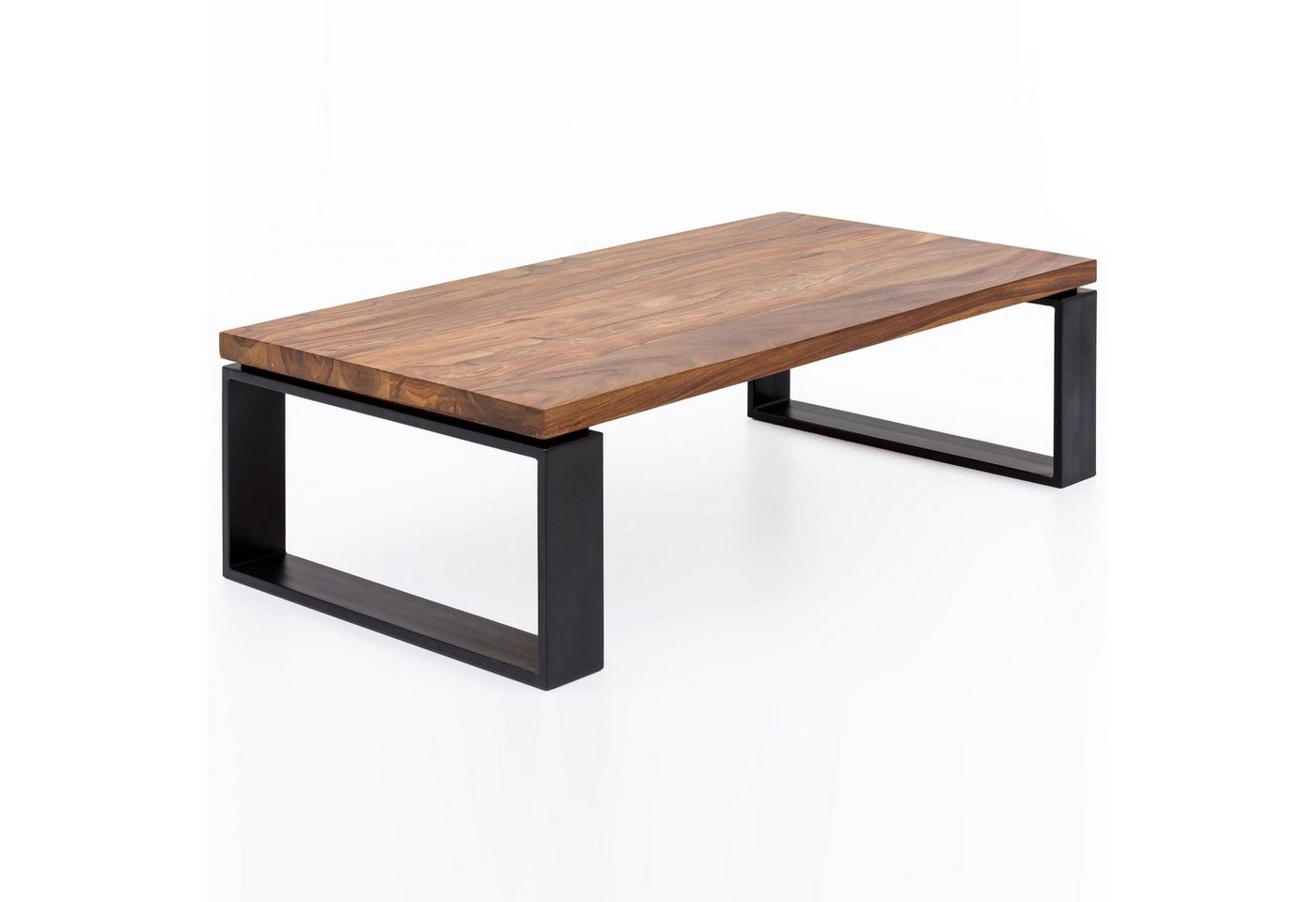 DesignMassiver Couchtisch im angesagten Industrial-DesignMaterialmix aus naturbelassenem Holz und robustem MetallGroße Tischplatte mit stabilem, kufenförmigem TischgestellAbmessungenBreite: 115 cmHöhe: 35 cm Tiefe: 60 cmTischplattenstärke: 4 cmWeitere Maße: siehe MaßbildFarbeTischplatte: BraunTischgestell: SchwarzBesonderheitenEmpfohlene max. Belastbarkeit: 50 kgDurch seine unvergleichbare Holzmaserung ist jeder Tisch ein absolutes UnikatDer Tisch wurde in liebevoller Handarbeit gefertigtHolzschutz bietet die Schutzlackversiegelung der OberflächenMaterialTischplatte: Massivholz SheeshamBeine: Eisen (lackiert)PflegehinweiseDie Oberfläche mit einem lauwarm angefeuchteten Baumwolltuch reinigen. Keine Scheuermittel, scharfen Reinigungsmittel oder tropfnassen Tücher verwenden.LieferumfangEin Wohnzimmertisch ohne DekorationMontageLieferzustand: Teilmontiert – Beine müssen angebracht werden