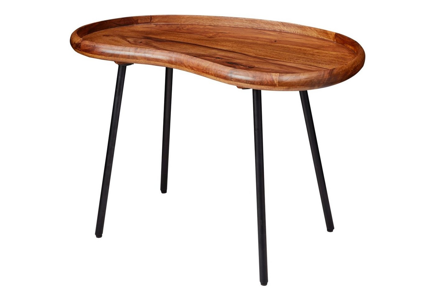 DesignCouchtisch in angesagter Retro-OptikTischplatte mit der typischen 50er-Jahre-NierenformFester Stand dank der stabilen MetallbeineAbmessungenBreite: 71 cmHöhe: 51 cmTiefe: 40 cmBoden bis Tischunterkante: ca. 46,5 cmWeitere Maße: siehe MaßbildFarbeTischplatte: Holzfarben (Sheesham)Beine: SchwarzBesonderheitenEmpfohlene max. Belastbarkeit: 50 kgHergestellt in liebevoller Handarbeit – jedes Sofatisch ein EinzelstückHolzschutz bietet die Schutzlackversiegelung der OberflächenGummierte Noppen an den Beinen bieten nicht nur Bodenschutz, sondern sind auch höhenverstellbarMaterialTischplatte: Massivholz SheeshamBeine: Eisen (lackiert)PflegehinweiseDie Oberfläche mit einem lauwarmen angefeuchtetem Baumwolltuch reinigen. Keine Scheuermittel, scharfen Reinigungsmittel oder tropfnassen Tücher verwenden. Keine weitere Behandlung der naturbelassenen Oberfläche (Ölen oder Wachsen) notwendig.LieferumfangEin Couchtisch ohne DekorationMontageLieferzustand: Teilmontiert – Beine müssen angebracht werden