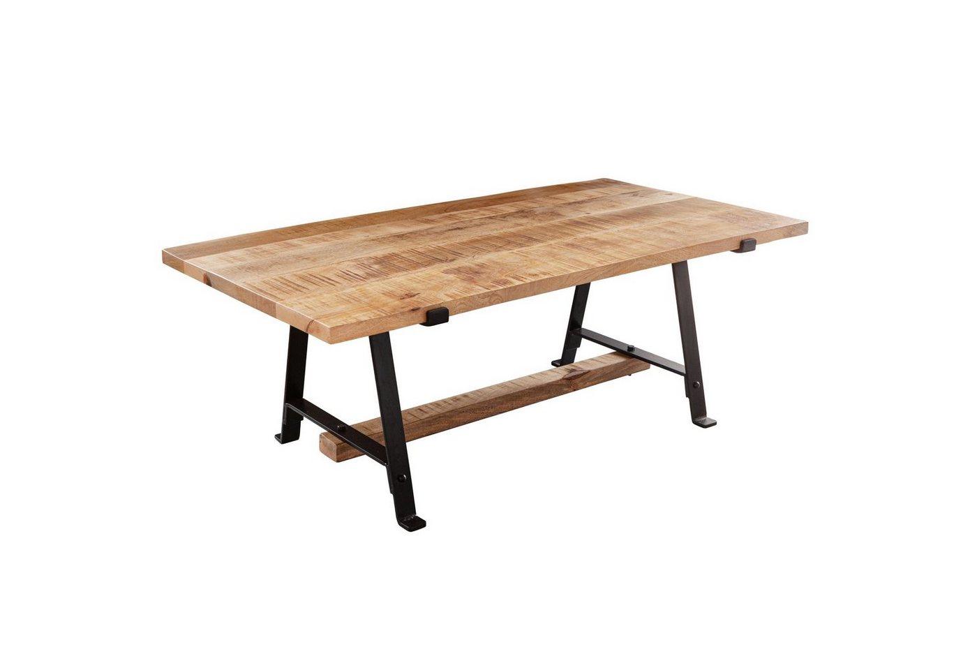 DesignRustikaler Couchtisch im modernen DesignDie schwarzen Metallbeine betonen den trendigen Industrial StyleAnmutige Tischplatte durch die schöne Maserung des MangoholzesAbmessungenBreite: 115 cmHöhe: 42 cmTiefe: 60 cmStärke der Tischplatte: 3 cmWeitere Abmessungen finden Sie im MaßbildMaximale Belastbarkeit: 50 kgFarbeTischplatte: BraunTischgestell: Schwarz mattBesonderheitenJeder Sofatisch wurde in liebevoller Handarbeit gefertigt und ist somit ein absolutes UnikatHohe Stabilität durch die gut durchdachte BeinkonstruktionDank der Pulverbeschichtung sind die Beine stoß- und kratzfestTipp: Mit kleinen Filzstreifen an den vier Unterkanten steht der Tisch weich auf jedem BodenbelagWir empfehlen die Oberflächen vor der ersten Benutzung mit klarem Schutzlack zu lackieren, um Wasserrändern vorzubeugenMaterialTischplatte: Naturbelassenes Mango MassivholzBeingestell: Schwarz pulverbeschichteter EdelstahlLieferumfangEin Couchtisch ohne DekorationMontageLieferzustand: teilmontiert, lediglich die Beine sind an die Tischplatte anzubringenPflegehinweiseDie Oberfläche mit einem lauwarm angefeuchteten Baumwolltuch reinigen. Kein Scheuermittel, scharfe Reinigungsmittel oder tropfnasse Tücher verwenden.