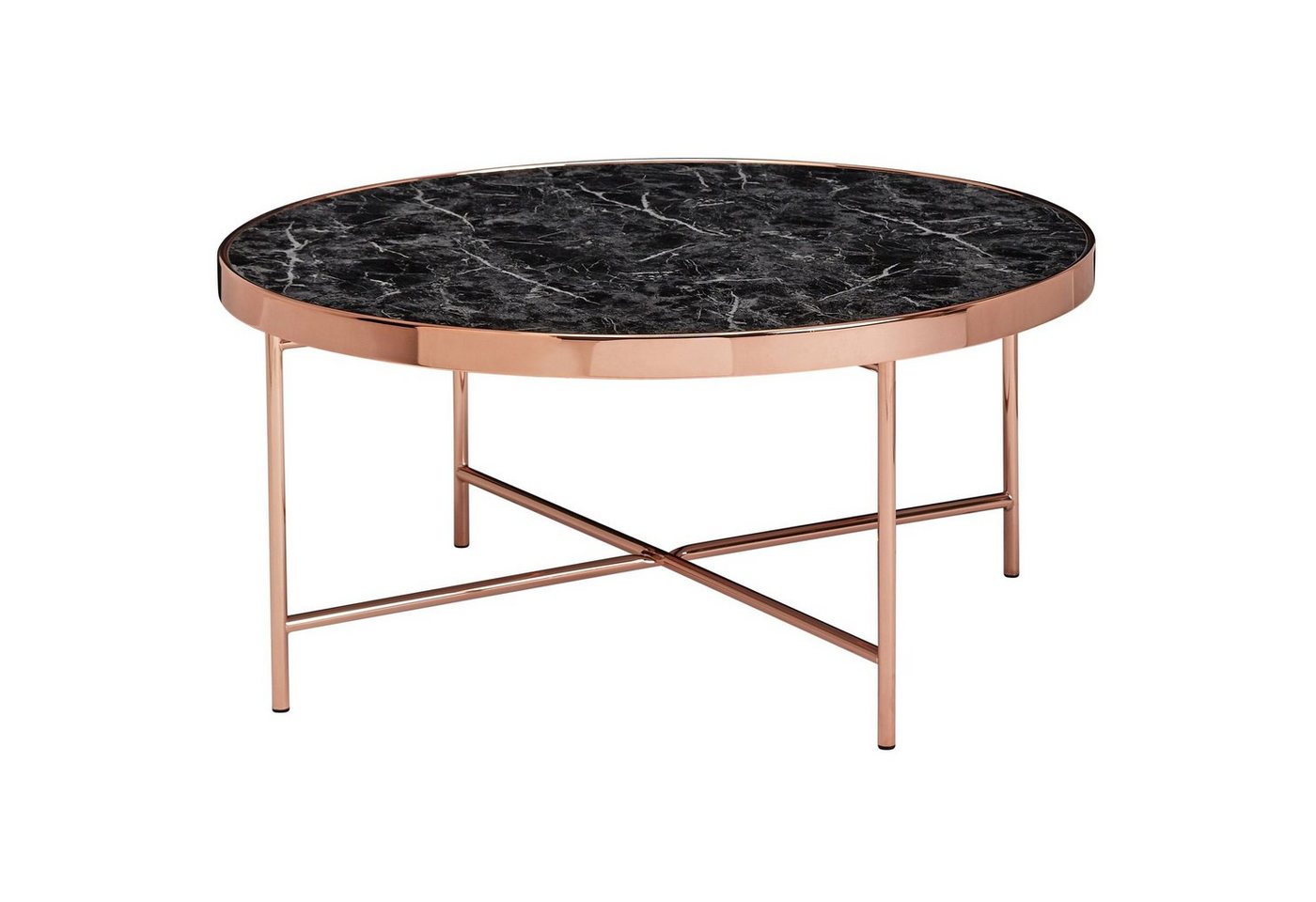 DesignReizender Couchtisch im modernen StilRunde Tischplatte auf filigranem MetallgestellAbmessungenBreite: 82,5 cmHöhe: 40 cmTiefe: 82,5 cmGlasplatte: Ø 81 cmTischplattenstärke: 0,5 cmTischrandstärke: 3,5 cmFarbeGlasplatte: Schwarz (Marmor-Optik)Tischbeine: KupferfarbenBesonderheitenEmpfohlene max. Belastbarkeit: 10 kgDie Tischplatte besitzt eine schöne Marmor-OptikSicherer Stand dank des stabilen MetallgestellsSchwarze Kunststoffkappen verhindern ein Verkratzen Ihres FußbodensDie metallenen Bauteile sind mit einer Schutzfolie überzogen – die Folie bitte nach der Montage entfernenMaterialTischplatte: Einscheiben-Sicherheitsglas (überzogen mit einer schwarzen Marmorfolie)Gestell: Stahl (lackiert)PflegehinweiseDie Oberfläche am besten mit einem lauwarmen, leicht angefeuchteten Baumwolltuch abwischen. Verwenden Sie zum Nachpolieren ein trockenes, fusselfreies Tuch.LieferumfangEin Wohnzimmertisch ohne DekorationMontageLieferzustand: Zerlegt und praktisch verpackt // Montagematerial und Aufbauanleitung sind inkl.