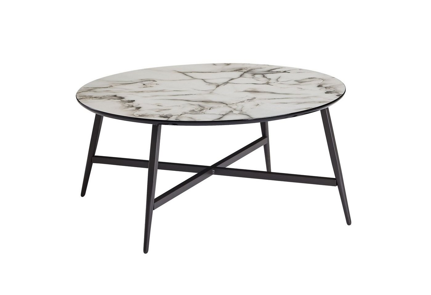 DesignRunder Couchtisch in Marmor-OptikStylischer Wohnzimmertisch in angenehmer FarbkombinationModerner Kaffeetisch mit schwarz lackierten BeinenAbmessungenBreite: 88 cmHöhe: 37 cmTiefe: 88 cmDurchmesser Tischplatte: 80 cmTischplattenstärke: 1,5 cmWeitere Abmessungen finden Sie im MaßbildFarbeTischplatte: Weiß (Marmor-Hochglanz-Optik)Gestell: Schwarz (matt)BesonderheitenSicherer Stand dank der stabilen BeinanordnungAufgrund des Designs lässt sich der Tisch in vielen Zimmern einsetzenEdles Flair dank der Marmor-OptikSchwarze Kunststoffkappen schützen Ihren Boden vor unschönen KratzernEmpfohlene max. Belastbarkeit: 10 kgMaterialTischplatte: foliertes MDF (mit PVC-Beschichtung)Gestell: Stahl (pulverbeschichtet)LieferumfangEin Couchtisch ohne DekorationMontageanleitung und -material liegen der Lieferung beiMontageLieferzustand: zerlegt und sicher verpacktPflegehinweiseDie Oberfläche mit einem lauwarm angefeuchteten Baumwolltuch reinigen. Keine Scheuermittel, scharfen Reinigungsmittel oder tropfnassen Tücher verwenden.