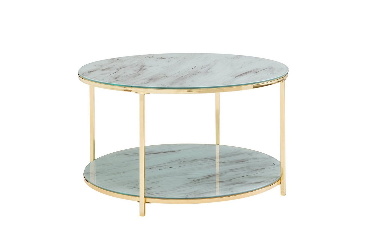 DesignRunder Couchtisch in modernem DesignTischplatten mit edler Marmor-OptikToller Materialmix aus Glas und MetallInsgesamt zwei Ablageflächen für Snacks, Fernbedienungen und ZeitschriftenAbmessungenBreite: 80 cmTiefe: 80 cmHöhe: 45 cmAbstand zwischen den Platten: 37 cmTischplattenstärke: 0,8 cmWeitere Abmessungen finden Sie im MaßbildFarbeTischplatte: Weiß (Marmor-Optik)Gestell: Gold (glänzend)BesonderheitenZwei praktische Ablageflächen für effizienten RaumgewinnEdles Flair dank der ausdrucksstarken Marmor-OptikKunststoffkappen schützen Ihren Fußboden und das Metall vor unschönen KratzernEmpfohlene Maximalbelastbarkeit Tischplatte: 8 kg // Ablagefläche: 8 kgMaterialTischplatte: foliertes EinscheibensicherheitsglasMetallgestell: lackierter StahlLieferumfangEin Couchtisch ohne DekorationMontageanleitung und -material liegen der Lieferung beiMontageLieferzustand: demontiert und sicher verpacktPflegehinweiseDie Oberfläche mit einem lauwarm angefeuchteten Baumwolltuch reinigen. Keine Scheuermittel, scharfe Reinigungsmittel oder tropfnasse Tücher verwenden.