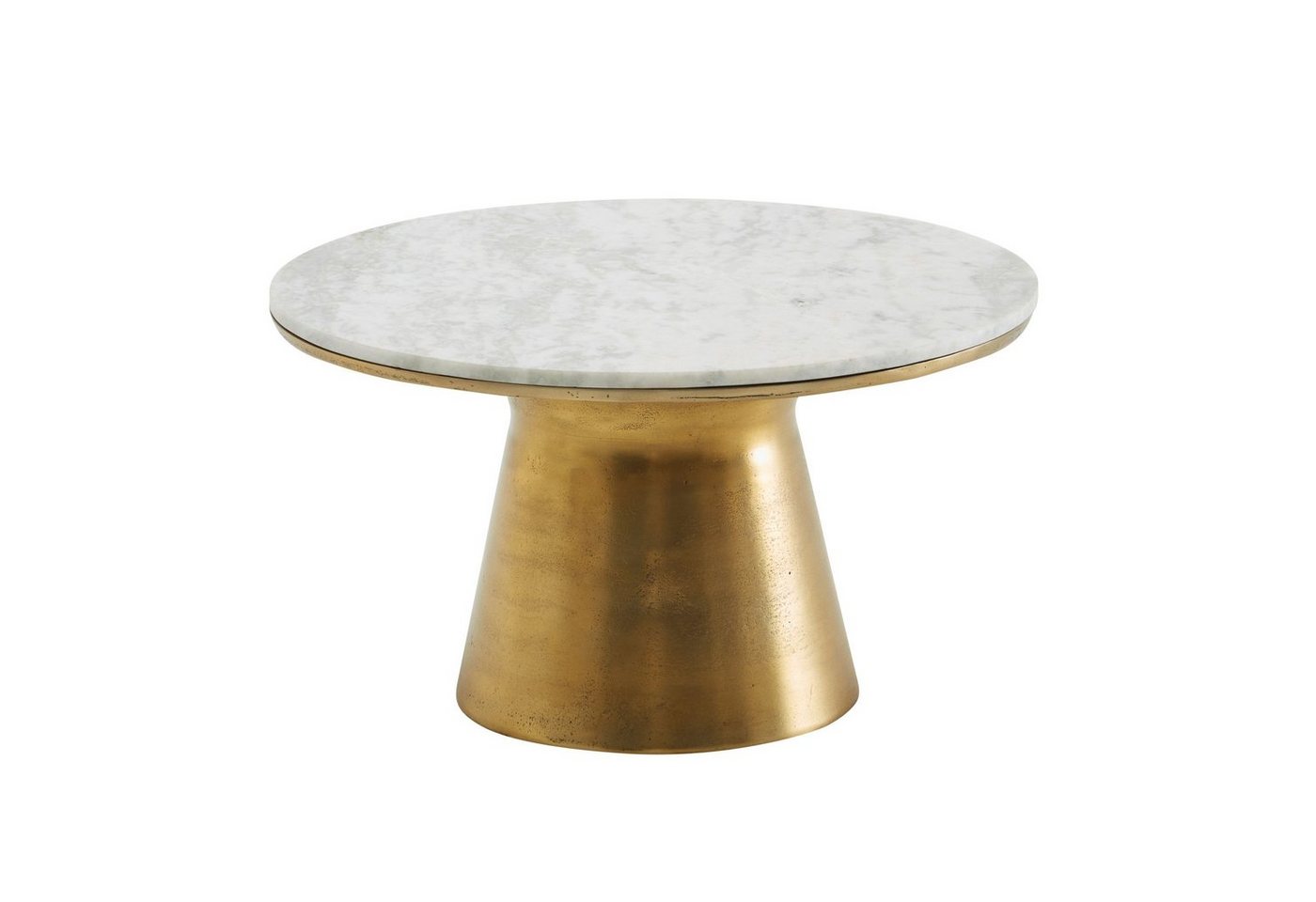 DesignRunder Couchtisch in modernem DesignTischplatte mit edler MarmorstrukturGoldfarbenes MetallgestellHarmonische Farbkombination aus Weiß und GoldAbmessungenBreite: 60 cmTiefe: 60 cmHöhe: 34 cmDurchmesser Tischplatte: 60 cmTischplattenstärke: 1,5 cmWeitere Abmessungen finden Sie im MaßbildFarbeTischplatte: WeißGestell: GoldenBesonderheitenJeder Tisch wurde in liebevoller Handarbeit gefertigt und ist somit ein absolutes UnikatTischplatte besteht aus echtem MarmorViel Platz zur Ablage von Zeitschriften, Handy und Co.Aufgrund des Designs ein echter Hingucker und für viele Räume geeignetEmpfohlene Maximalbelastbarkeit: 30 kgMaterialTischplatte: indischer MarmorMetallgestell: lackiertes AluminiumLieferumfangEin Couchtisch ohne DekorationMontageLieferzustand: komplett montiert und sicher verpacktPflegehinweiseWischen Sie den Marmor regelmäßig trocken ab (Fensterleder ist hierfür ideal geeignet), damit dieser seine glänzende Oberfläche behält. Die Reinigung sollte mit kreisenden &, sanften Bewegungen durchgeführt werden, damit die Oberfläche nicht verkratzt.