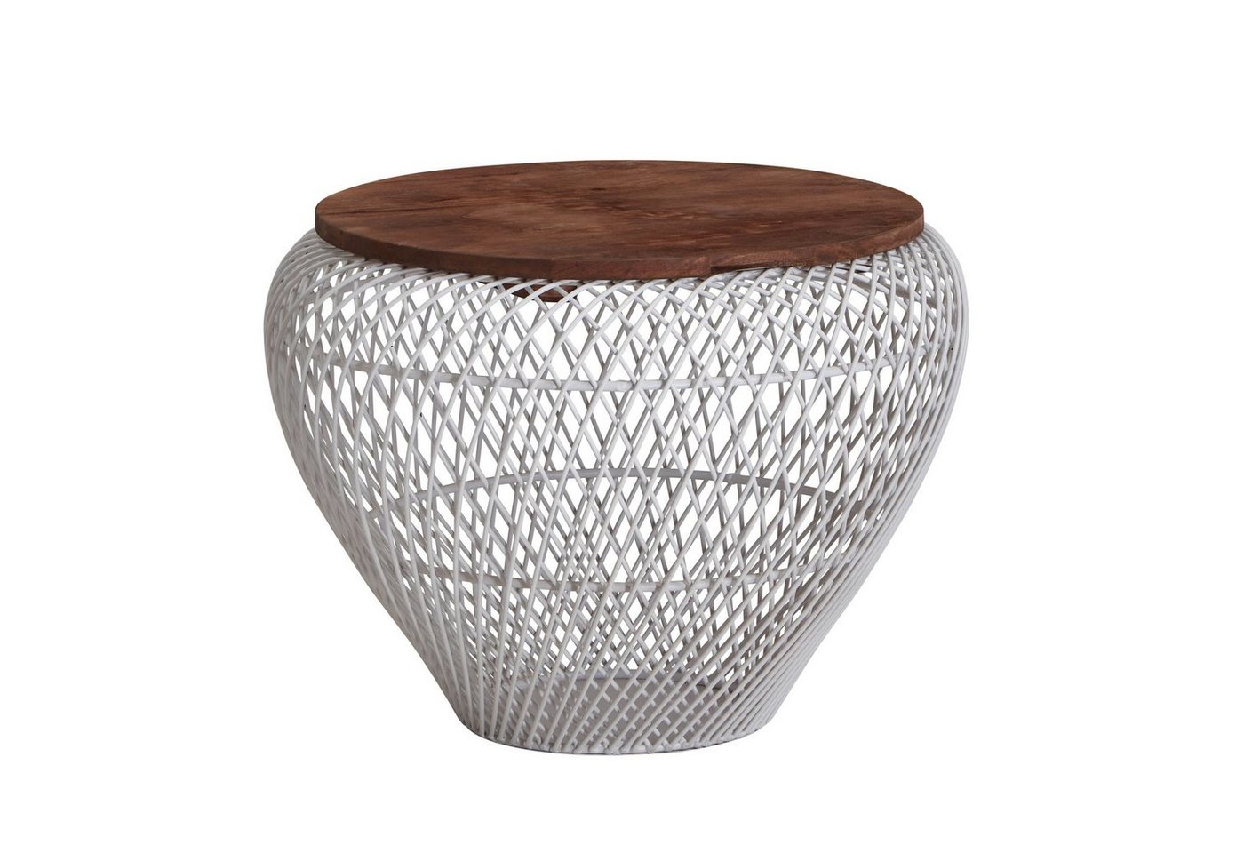 DesignRunder Couchtisch in modernem DesignOffen gestaltetes KorbgestellElegante Holzmaserung der TischplatteAbmessungenBreite: 60 cmTiefe: 60 cmHöhe: 45 cmStärke der Tischplatte: ca. 1,5 cmHöhe des Staufachs: ca. 43,5 cmMaße der Öffnung (BxT): 46,5 x 46,5 cmWeitere Abmessungen finden Sie im MaßbildFarbeTischplatte: BraunUntergestell: WeißBesonderheitenJeder Tisch wurde in liebevoller Handarbeit gefertigt und ist somit ein absolutes UnikatAufgrund der Handarbeit kann es zu leichten Farbabweichungen und Unebenheiten kommenTischplatte dient als Deckel und lässt sich durch die Griffmulden bequem abnehmenPraktischer Stauraum im Inneren des Gestells für z.B. Kissen oder Decken Die Holzoberfläche ist mit einem schützenden Klarlack versiegeltEmpfohlene Maximalbelastbarkeit: 15 kgMaterialTischplatte: Recyceltes Mango Massivholz, mit Klarlack beschichtetMetallgestell: lackiertes EisenLieferumfangEin Couchtisch ohne DekorationMontageLieferzustand: komplett montiert und sicher verpacktPflegehinweiseDie Oberfläche mit einem lauwarm angefeuchteten Baumwolltuch reinigen. Keine Scheuermittel, scharfen Reinigungsmittel oder tropfnassen Tücher verwenden.