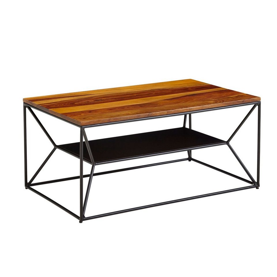 DesignRechteckiger Couchtisch im angesagten Industrial-StilToller Materialmix aus Massivholz und MetallElegante und ausdrucksstarke HolzmaserungInsgesamt zwei Ablageflächen für Snacks, Fernbedienungen und ZeitschriftenAbmessungenBreite: 85 cmTiefe: 55 cmHöhe: 40 cmAblagefach (BxHxT): 63,5 x 18 x 34 cmTischplattenstärke: 1,5 cmMaterialstärke Gestell: 1 cmWeitere Abmessungen finden Sie im MaßbildFarbeTischplatte: BraunGestell und Ablage: SchwarzBesonderheitenJeder Tisch wurde in liebevoller Handarbeit gefertigt und ist somit ein absolutes UnikatDa es sich um Handarbeit und um ein Naturprodukt handelt, kann es zu Farbabweichungen oder Unebenheiten kommenHolzschutz bietet die Schutzlackversiegelung der OberflächenZwei praktische Ablageflächen für effizienten RaumgewinnAnti-Rutsch-Noppen an den Beinen schützen Ihren Fußboden und das Metall vor unschönen KratzernEmpfohlene Maximalbelastbarkeit Tischplatte: 35 kg // Ablagefläche: 15 kgMaterialTischplatte: Sheesham Massivholz, mit Klarlack beschichtetGestell und Ablage: pulverbeschichtetes EisenLieferumfangEin Couchtisch ohne DekorationMontageLieferzustand: komplett montiert und sicher verpacktPflegehinweiseDie Oberfläche mit einem lauwarm angefeuchteten Baumwolltuch reinigen. Keine Scheuermittel, scharfe Reinigungsmittel oder tropfnasse Tücher verwenden.