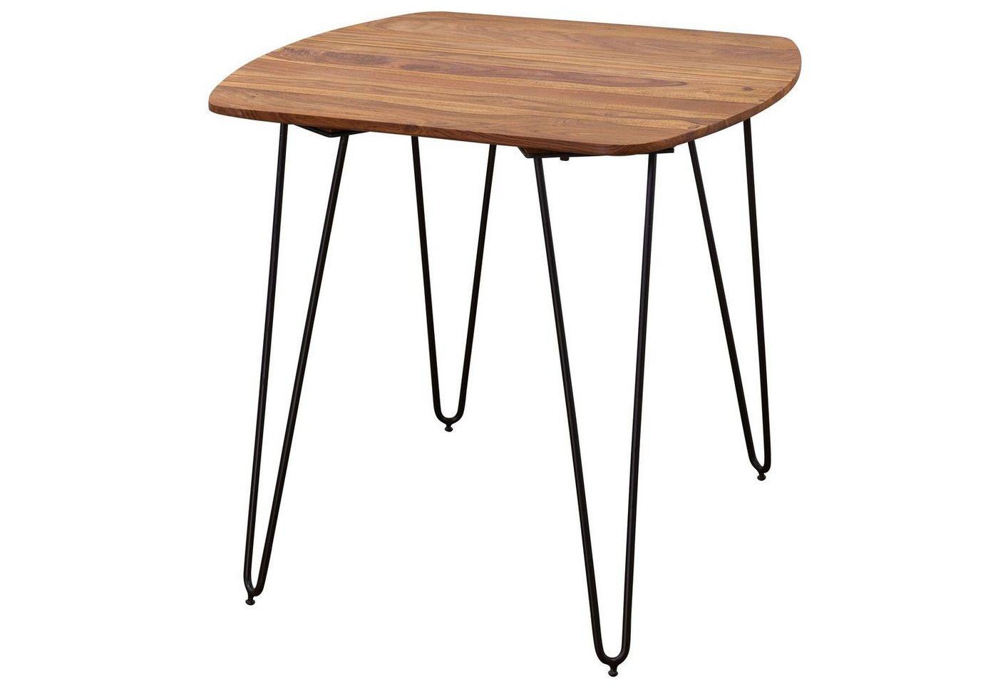 DesignEsstisch als Blickfang durch sein modernes DesignQuadratische Tischplatte mit abgerundeten EckenHaarnadelförmige Beine aus MetallAbmessungenBreite: 80 cmTiefe: 80 cmHöhe: 76 cmBesonderheitenHohe Stabilität durch das Metallgestell und die massive TischplatteDurch die Verwendung von Edelhölzern wird auch das Mobiliar edelDie schöne Maserung und die Handarbeit machen den Tisch zu einem UnikatFarbeTischplatte: BraunTischbeine und Gestell: SchwarzMaterialTischplatte: Sheesham MassivholzTischbeine und Gestell: MetallLieferumfangEin Esstisch ohne DekorationMontageanleitung und Montagematerial liegen der Lieferung beiMontageLieferzustand: zerlegt und praktisch verpackt, lediglich die Beine müssen angebracht werden