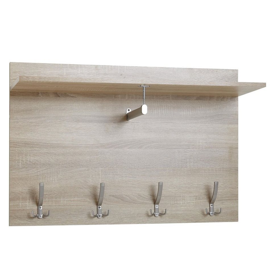 DesignRechteckiges Garderobenpaneel in modernem DesignWandgarderobe mit vier Doppelhaken, einer Ablagefläche und einer KleiderstangeElegantes und auffälliges Sonoma Eiche-DekorAbmessungen Breite: 80 cmHöhe: 60 cmTiefe: 29,5 cmAblagefläche (BxT): 80 x 28 cmMaterialstärke: 1,5 cmWeitere Abmessungen finden Sie im MaßbildFarbeKorpus und Ablage: Sonoma EicheHaken und Kleiderstange: SilbernBesonderheitenAblagefläche für Hüte, Taschen &, Co.Vier Doppelhaken bieten Platz für Jacken und MäntelKleiderbügel lassen sich an die Kleiderstange hängenKratzfeste Oberfläche dank der MelaminharzbeschichtungDurch das Melamin ist die Garderobe zudem wasserabweisendEmpfohlene Maximalbelastbarkeit: 5 kgMaterialKorpus und Ablage: folierte Spanplatte mit MelaminharzbeschichtungHaken und Kleiderstange: MetallLieferumfangEine Wandgarderobe ohne DekorationMontageanleitung und -material inklusiveMontageLieferzustand: demontiert und sicher verpacktPflegehinweisMit einem feuchten Tuch, evtl. mit mildem Reinigungsmittel abwischen, mit trockenem Tuch nachwischen – keine scharfen oder lösungsmittelhaltigen Reiniger verwenden.
