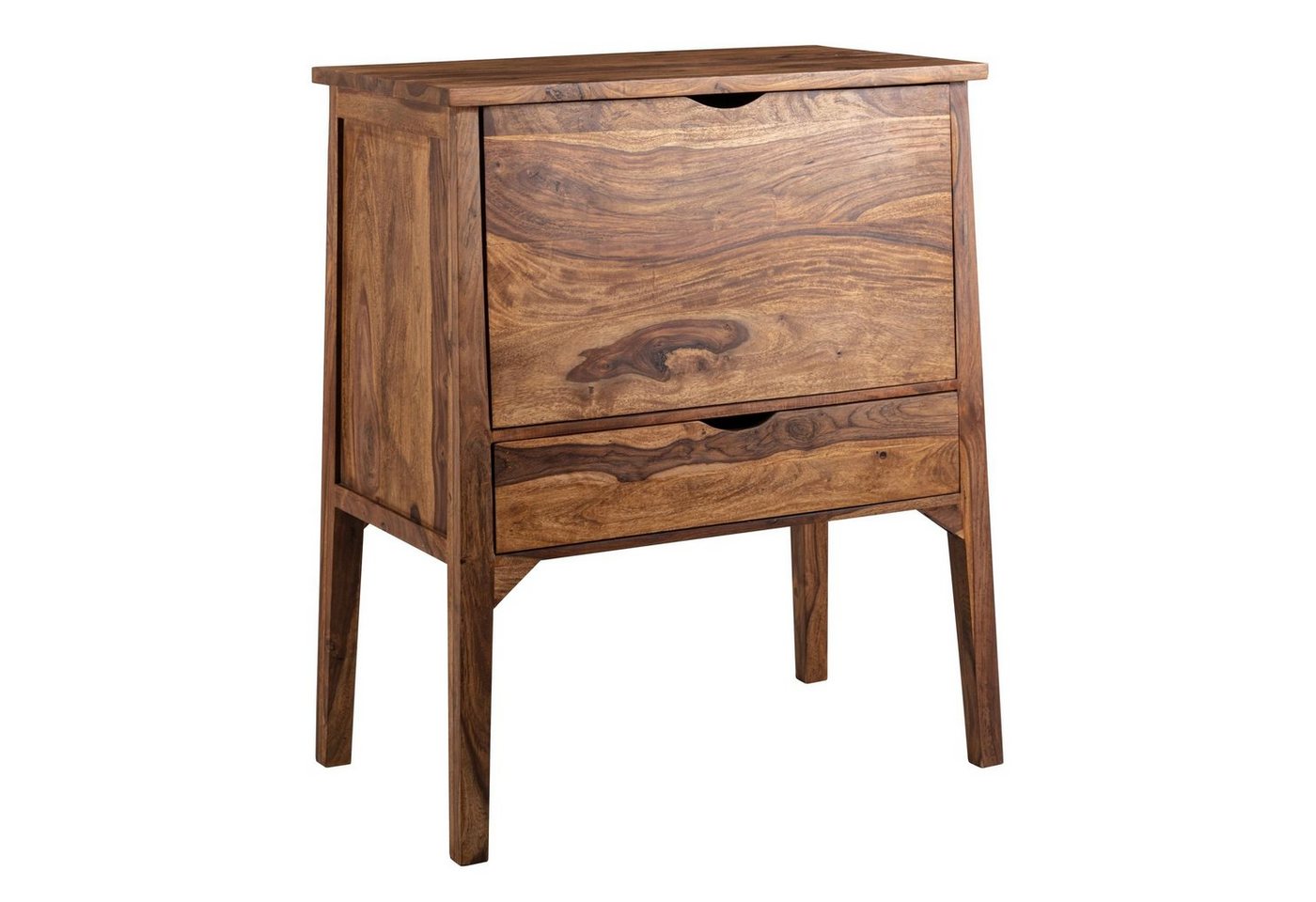 DesignRustikale Kommode mit aufklappbaren TürenKleiner Schrank im angesagten LandhausstilAnrichte mit zwei Türen und einer SchubladeAbmessungenBreite: 90 cmHöhe: 107 cmTiefe geschlossen: 56 cmTiefe geöffnet: 135 cmInnenmaße des Korpus (BxHxT): 75 x 44,5 x 47 cmInnenmaße der Schublade und weitere Abmessungen: siehe MaßbilderMaximalbelastbarkeit: 50 kgFarbeBraunBesonderheitenBeidseitig aufklappbare Türen für einen besonders guten ÜberblickTüren sind mit Ketten gesichert, so dass sich auch kurzfristig etwas darauf abstellen lässtDie Schublade ist unterteilt, um Besteck oder kleine Helfer geordnet darin zu verstauenHochklappbare Ablage erleichtert den Eingriff in die KommodeGriffmulden für ein einfaches Öffnen und Schließen der KlappenWir empfehlen die Oberflächen vor der ersten Benutzung mit klarem Schutzlack zu lackieren, um Wasserrändern vorzubeugenMaterialKorpus und Beine: Sheesham Massivholz – mit Klarlack beschichtetScharniere und Ketten: MetallLieferumfangEine aufklappbare Kommode ohne DekorationMontageBei dem Sideboard ist kein Aufbau nötig, da dieses komplett montiert zu Ihnen geliefert wird.PflegehinweiseDie Oberfläche mit einem lauwarm angefeuchteten Baumwolltuch reinigen. Keine Scheuermittel, scharfe Reinigungsmittel oder tropfnasse Tücher verwenden.