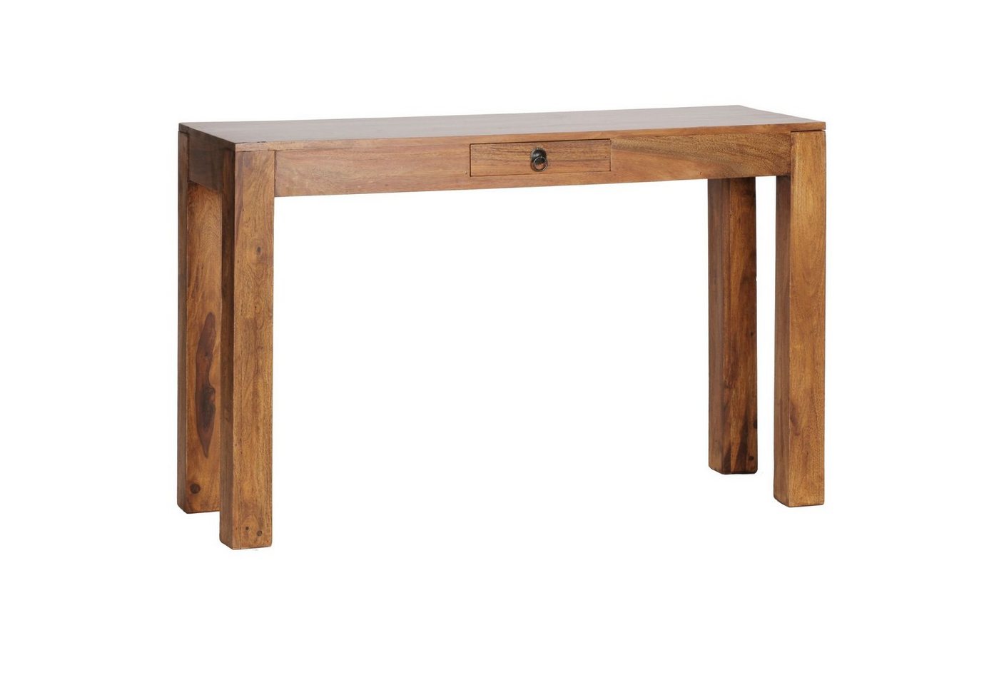 DesignWunderschöner LandhausstilEinzigartige MaserungEine Schublade für Notizzettel, Schlüssel usw.AbmessungenBreite: 120 cm Höhe: 70 cmTiefe: 40 cmInnenabmessungen SchubladeBreite: 37 cmHöhe: 6 cmTiefe: 40 cmFarbeKompletter Tisch: Holzfarben (Sheesham)BesonderheitenEmpfohlene max. Belastbarkeit: 50 kgGefertigt in liebevoller Handarbeit – jeder Tisch ein absolutes UnikatAuch als Schminktisch, Schreibtisch oder Sekretär einsetzbarDa es sich um Handarbeit und um ein Naturprodukt handelt kann es zu Farbabweichungen oder Unebenheiten kommenMaterialKompletter Tisch: Massivholz SheeshamPflegehinweiseDie Oberfläche mit einem lauwarm angefeuchteten Baumwolltuch reinigen. Keine Scheuermittel, scharfen Reinigungsmittel oder tropfnassen Tücher verwenden. Keine weitere Behandlung der naturbelassenen Oberfläche (Ölen, Wachsen) notwendig.LieferumfangEin Konsolentisch ohne DekorationMontageLieferzustand: Teilmontiert // leicht verständliche Montageanleitung inklusive // einfacher und schneller Aufbau dank gut durchdachter Konstruktion