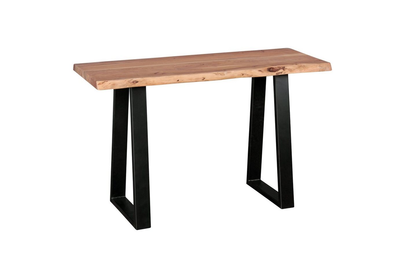 Design und Verwendung: Die natürlichen Unebenheiten und die Wuchtigkeit machen die Konsole einzigartig. Durch die kompakte Größe von 120 cm findet man auch in kleineren Räumen den perfekten Platz für den Tisch – sowohl als Konsolentisch, als auch als Schreibtisch verwendbar. Auch ein Bürostuhl lässt sich unter den Tisch schieben. DesignHolztisch in modernem LandhausstilEinzigartige Maserung auf der TischplatteRechteckige Form der Tischplatte mit unregelmäßigen KantenRobuste Metallfüße in Triangelform – schwarz lackiertAbmessungenBreite: ca. 120 cmTiefe: ca. 45 cmHöhe: ca. 75 cmBeinstärke: 8 cmTischplattenstärke: 4 cmBoden bis Tischunterkante: ca. 71 cmAbstand zwischen den Beinen: 75 cmFarbeTischplatte: Holzfarben (Akazie)Gestell: SchwarzBesonderheitenEmpfohlene max. Belastbarkeit: 70 kgHandgefertigtes Naturprodukt mit Liebe zum Detail – Farbabweichungen und Unebenheiten machen das Produkt zu einem EinzelstückAus dem Baum herausgearbeitete Platte – klares &, natürliches ErscheinungsbildTischplatte (4 cm) &, Beine (8 cm) sind besonders stark – hohe Stabilität, kein Umkippen bei BelastungHohe Materialdichte des unbehandelten Akazienholzes &, Stärke der Platte – lange LebensdauerMaterialTischplatte: Massivholz Akazie (unbehandeltes Naturholz)Beine: Eisen (lackiert)PflegehinweiseDie Oberfläche mit einem lauwarm angefeuchteten Baumwolltuch reinigen. Keine Scheuermittel, scharfen Reinigungsmittel oder tropfnassen Tücher verwenden.LieferumfangEin Konsolentisch ohne DekorationMontageLieferzustand: Teilmontiert – lediglich die Beine sind noch anzubringen