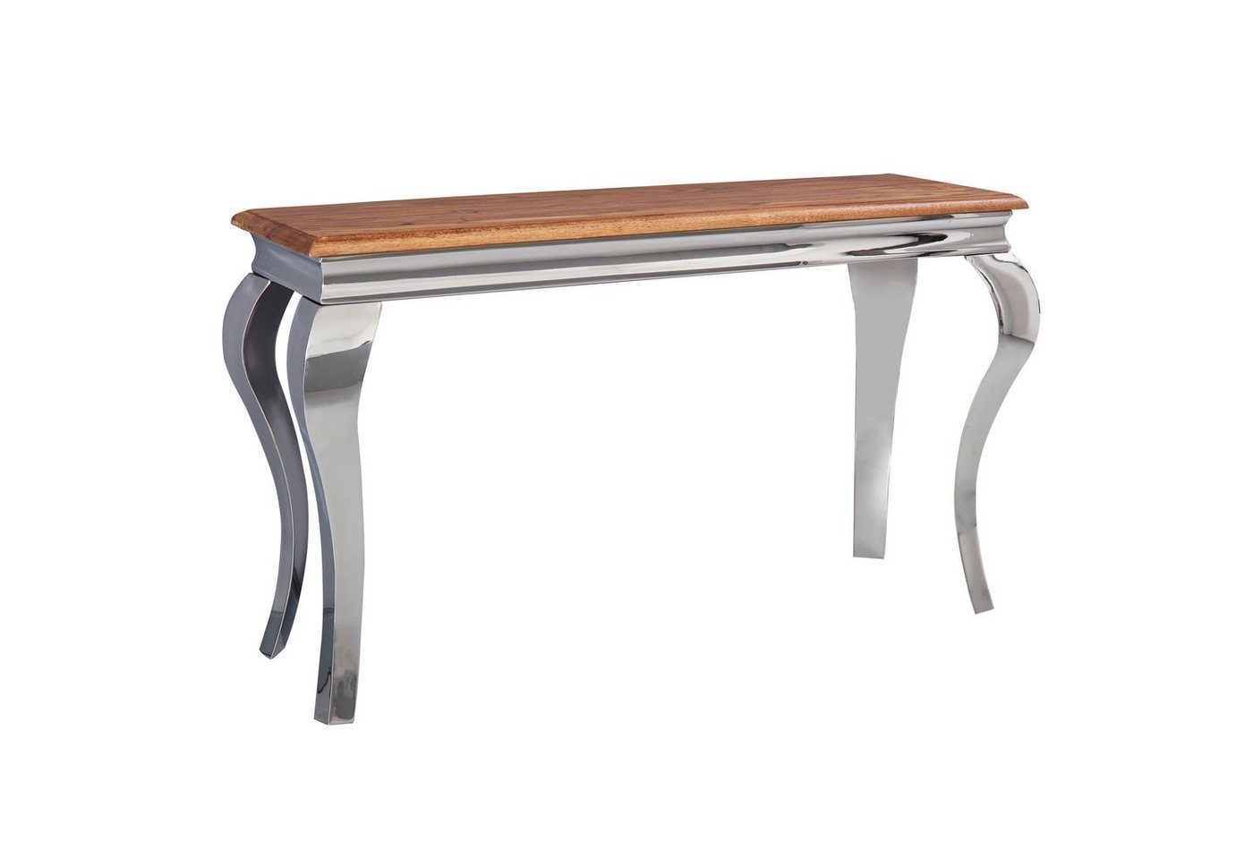 DesignBeeindruckender Konsolentisch im modernen und eleganten DesignLange Tischplatte zur Ablage von diversen UtensilienEdle Erscheinung durch die glänzenden Beine im Barock-StilAbmessungenBreite: 130 cmHöhe: 76,5 cmTiefe: 42 cmTischplattenstärke: 2,5 cmWeitere Abmessungen finden Sie im MaßbildMaximale Belastbarkeit: 50 kgFarbeTischplatte: BraunBeine: SilbernBesonderheitenJede Anrichte wurde in liebevoller Handarbeit gefertigt und ist somit ein absolutes UnikatTipp: Mit kleinen Filzstreifen an den vier Beinen steht der Tisch weich auf jedem BodenbelagWir empfehlen die Oberflächen vor der ersten Benutzung mit klarem Schutzlack zu lackieren, um Wasserrändern vorzubeugenMaterialTischplatte: Sheesham MassivholzMetallgestell: Polierter EdelstahlLieferumfangEin Konsolentisch ohne DekorationMontageanleitung und -material liegen der Lieferung beiMontageLieferzustand: teilmontiert, lediglich die Beine müssen angebracht werdenPflegehinweiseDie Oberfläche mit einem lauwarm angefeuchteten Baumwolltuch reinigen. Kein Scheuermittel, scharfe Reinigungsmittel oder tropfnasse Tücher verwenden.