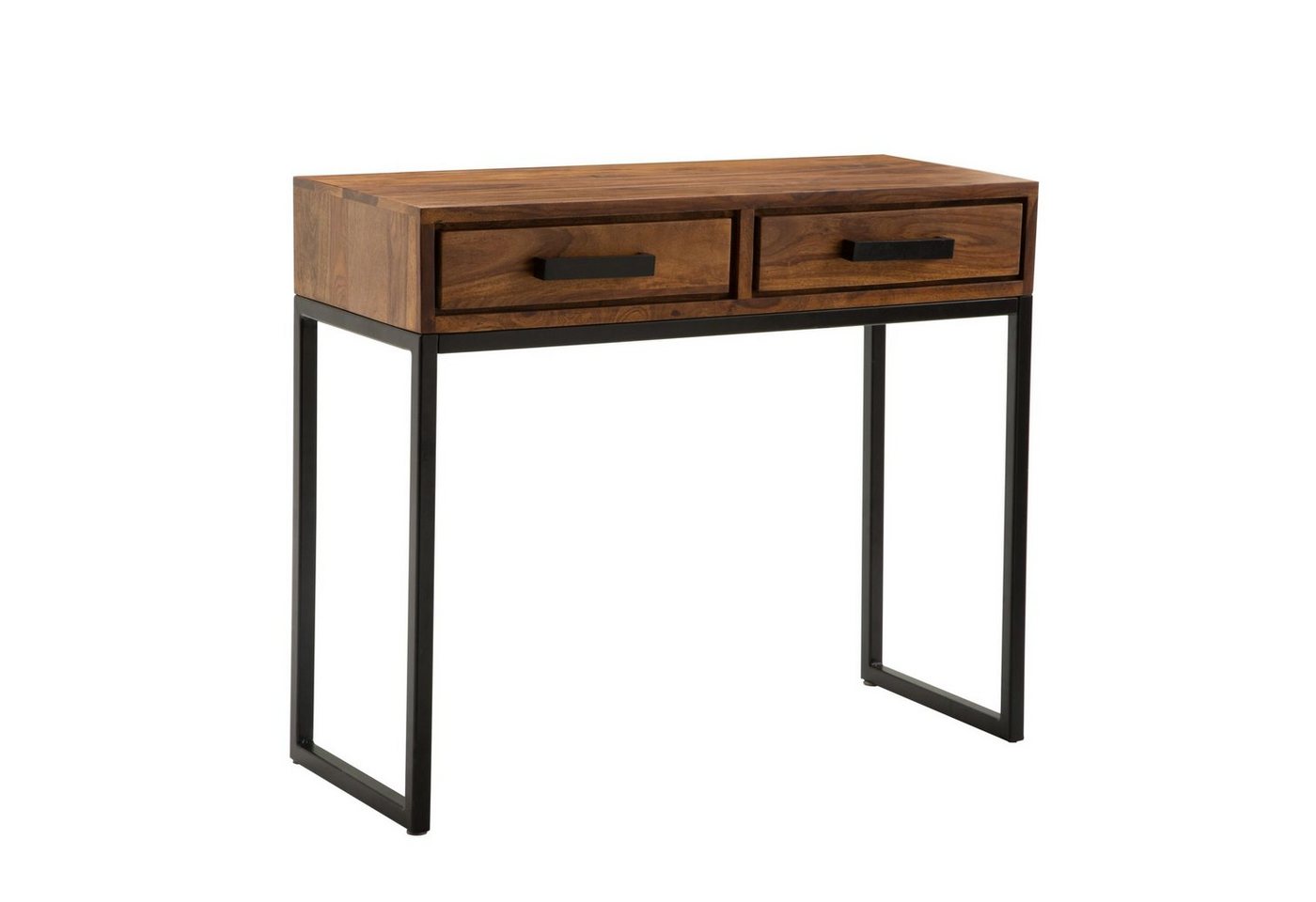 DesignSchicker Konsolentisch im modernen DesignDie schwarzen Metallbeine bringen einen Hauch Industrial-Style in Ihr ZuhauseAnmutige Tischplatte durch die schöne Maserung des Sheeshamholzes AbmessungenBreite: 90 cmHöhe: 76,5 cmTiefe: 35,5 cmInnenmaße je Schublade (BxHxT): 36 x 5,5 x 30 cmWeitere Abmessungen finden Sie im MaßbildMaximale Belastbarkeit: 40 kgFarbeTischplatte: BraunTischgestell und Griffe: SchwarzBesonderheitenJede Konsole wurde in liebevoller Handarbeit gefertigt und ist somit ein absolutes UnikatHohe Stabilität durch die robusten MetallbeineDank der Pulverbeschichtung sind die Beine stoß- und kratzfestAnti-Rutsch-Pads schützen den Fußboden und das Metall vor unschönen KratzernDie zwei Schubladen bieten Ihnen reichlich Stauraum, um Gegenstände sauber zu verstauenAufgrund der Drehstopper sind die Schübe komplett herausziehbarMaterialTischplatte: Sheesham Massivholz – mit Klarlack beschichtetBeine und Griffe: Pulverbeschichteter EdelstahlLieferumfangEin Konsolentisch ohne DekorationMontageLieferzustand: teilmontiert, lediglich die Beine sind an die Tischplatte anzubringenPflegehinweiseDie Oberfläche mit einem lauwarm angefeuchteten Baumwolltuch reinigen. Keine Scheuermittel, scharfe Reinigungsmittel oder tropfnasse Tücher verwenden.