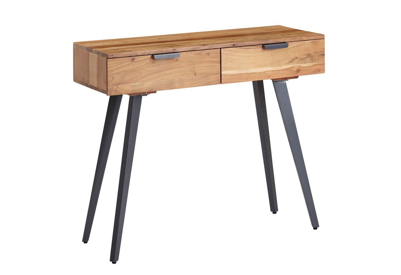 DesignModerner Konsolentisch mit angesagtem Materialmix aus Holz und MetallGeräumige Ablagefläche bietet viel Platz für diverse UtensilienZusätzlichen Stauraum bieten die zwei geräumigen SchubladenAbmessungenBreite: 90 cmHöhe: 78 cmTiefe: 36 cmInnenmaße pro Schublade (BxHxT): 37,5 x 12 x 28 cmBoden bis Tischunterkante: 61,5 cmMaterialstärke: 1,5 cmMaximalbelastbarkeit: 50 kgFarbeKorpus: BraunBeine und Griffe: GrauBesonderheitenDurch seine unvergleichbare Farbgebung und die Holzmaserungen ist jede Konsole ein absolutes UnikatDas von Hand hergestellte Möbelstück sorgt für eine individuelle Note in Ihrem ZuhauseHohe Stabilität durch das hochwertig verarbeitete Massivholz und die stabilen MetallbeineDer Korpus des Abstelltisches ist mit einem schützenden Klarlack überzogenKleine Kunststoffkappen schützen Ihren Fußboden und das Metall vor unschönen KratzernDie zwei Schubladen bieten Ihnen reichlich Stauraum, um Gegenstände sauber zu verstauenAufgrund der Drehstopper sind die Schübe komplett herausziehbarMaterialKorpus: Akazie Massivholz, mit Klarlack beschichtetBeine und Griffe: lackiertes EisenLieferumfangEin Konsolentisch ohne DekorationMontageanleitung und -material liegen der Lieferung beiMontageLieferzustand: teilmontiert, lediglich die Beine müssen angebracht werdenPflegehinweiseDie Oberfläche mit einem lauwarm angefeuchteten Baumwolltuch reinigen. Keine Scheuermittel, scharfe Reinigungsmittel oder tropfnasse Tücher verwenden.