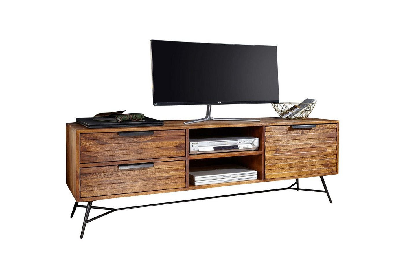 DesignAußergewöhnliches Lowboard im angesagten Industrial-LookSchubladen und Ablagefach bieten viel StauraumIndividuelle Maserung und Farbgestaltung machen jeden Tisch einzigartigHohe Stabilität dank der robusten Tischbeine und der QuerstrebeAbmessungenHöhe: 54 cmBreite: 160 cmTiefe: 40 cmFarbeLowboard: BraunGestell: Schwarz mattBesonderheitenDurch seine unvergleichbare Farbgebung und die Holzmaserungen ist jeder Tisch ein absolutes UnikatDas von Hand hergestellte Möbelstück sorgt für eine individuelle Note in Ihrem ZuhauseHohe Stabilität durch das verarbeitete Massivholz in Kombination mit dem EisengestellDie Oberfläche des Tisches ist mit einem schützenden Klarlack überzogenKunststoffnoppen an den Füßen verhindern Kratzer in Ihrem FußbodenMaterialKorpus: Sheesham Massivholz – aufwendig verarbeitetBeine: EisenLieferumfangEin Lowboard ohne DekorationMontageLieferzustand: Montiert PflegehinweiseDie Oberfläche mit einem lauwarm angefeuchteten Baumwolltuch reinigen. Kein Scheuermittel, scharfe Reinigungsmittel oder tropfnasse Tücher verwenden.