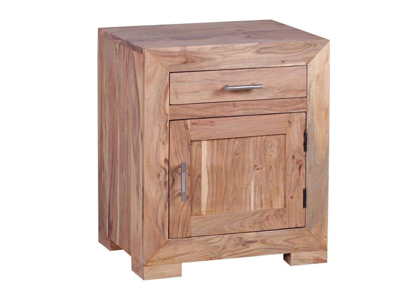 Sie sind auf der Suche nach einem modernen und praktischen Nachttisch für Ihr Schlafzimmer? Massivholz-Nachtkonsole von WOHNLING. Wofür geeignet? Durch die Höhe von 60 cm ist diese Nachtkonsole auch ideal für Boxspringbetten geeignet. Pflegehinweise: Die Oberfläche mit einem lauwarm angefeuchteten Baumwolltuch reinigen. Keine Scheuermittel, scharfen Reinigungsmittel oder tropfnassen Tücher verwenden. Keine weitere Behandlung der naturbelassenen Oberfläche (Ölen, Wachsen) notwendig. DesignRomantischer LandhausstilEinzigartige MaserungEdle Metall-Griffe an der Schublade und TürAbmessungenBreite: 50 cmHöhe: 60 cmTiefe: 40 cmInnenmaße SchubladeBreite: 33,5 cmHöhe: 25,5 cmTiefe: 6,5 cmInnenmaße TürOberes Ablagefach B x H x T: 46 x 21,5 x 36 cmUnteres Ablagefach B x H x T: 46 x 14,5 x 36 cmFußhöhe: 4 cmFarbeKompletter Nachtkasten: Holzfarben (Akazie)Griff: ChromfarbenBesonderheitenGefertigt in liebevoller Handarbeit – jeder Artikel ein absolutes UnikatTür mit MagnetverschlussSchubladenstopp – Verhindert das Herausfallen der SchubladeMaterialKompletter Nachtkasten: Massivholz AkazieGriff: MetallDa es sich um Handarbeit und ein Naturprodukt handelt, kann es zu Farbabweichungen oder Unebenheiten kommenLieferumfang Ein Nachttisch ohne DekorationMontageLieferzustand: Montiert