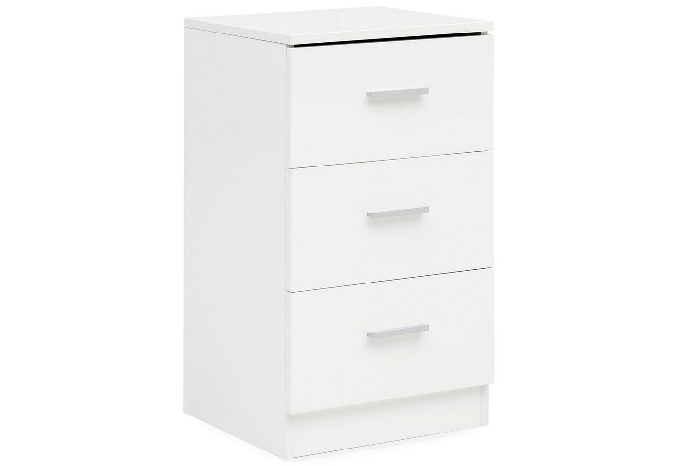 DesignNachtkonsole im modernen, geradlinigen DesignEdles Nachtkästchen mit drei Schubladen in HochglanzoptikDrei silberne Griffe zieren die SchubkästenAbmessungenBreite: 38 cmHöhe: 66,5 cmTiefe: 35 cmInnenmaße je Schublade (B x H x T): 29,5 x 16 x 28,5 cmFarbeKompletter Nachtkasten: Weiß (Hochglanz)Griffe: SilberfarbenBesonderheitenGeräumige Schubladen zur Unterbringung von Büchern, Brille und Co.Die Höhe des Nachtkästchens ist ideal für Boxspringbetten geeignetGroße Ablage für Nachttischleuchte und andere GegenständeDie kleine Kommode ist leicht mit unterschiedlichen Einrichtungsstilen kombinierbarWeiße Anti-Rutsch-Noppen schützen Ihren Boden vor unschönen KratzernMaterialKorpus und Schubladen: Spanplatte, melaminharzbeschichtetGriffe: AluminiumInformation zur MelaminharzbeschichtungDas Kunstharz Melamin ist aufgrund seiner Eigenschaften ein idealer Werkstoff, um Möbel zu beschichten. Es bildet äußerst harte und kratzfeste Oberflächen und ist dabei wasserabweisend und fettfest.PflegehinweiseMit feuchtem Tuch, evtl. mit mildem Reinigungsmittel abwischen, mit trockenem Tuch nachwischen. Keine scharfen oder lösungsmittelhaltigen Reiniger verwenden.LieferumfangEine Nachtkonsole ohne Dekoration // Montageanleitung und -material inkl.MontageLieferzustand: Zerlegt und praktisch verpackt // Einfacher und schneller Aufbau dank gut durchdachter Konstruktion