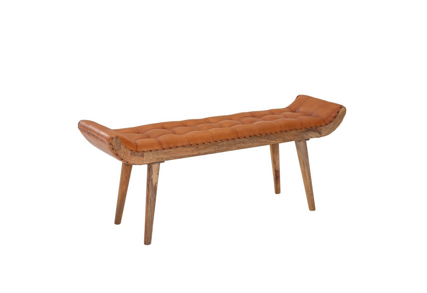 DesignStylische Ledersitzbank in modernem DesignStimmiger Materialmix aus Massivholz und LederÜppige Polsterung für ein angenehmes SitzgefühlWunderschönes Chesterfield-Muster auf der SitzoberflächeEleganter Nietenrand führt um die Sitzfläche herumAbmessungenBreite: 125 cmHöhe: 50 cmTiefe: 38 cmHöhe der Sitzfläche (Holz und Leder): 10 cmSitzhöhe: 47 cmAbstand Boden bis Bankunterseite: 37 cmFarbeKomplette Bank: BraunHolz und Leder können farblich vom Bild leicht abweichen, da es sich um Naturprodukte handeltBesonderheitenFester und stabiler Stand dank der robusten MassivholzbeineSehr weiche Polsterung sorgt für ein angenehmes SitzgefühlHochwertiger &, robuster Sitzbezug aus EchtlederAnti-Rutsch-Pads an den Fußenden schützen Ihren Fußboden vor KratzernIn liebevoller Handarbeit gefertigt – daher ist jedes Stück ein UnikatEmpfohlene Maximalbelastbarkeit: 160 kgMaterialSitzflächenbezug: ZiegenlederBeine: Mango Massivholz, mit Klarlack beschichtetNieten: MetallTextilzusammensetzungSitzflächenbezug: 100% EchtlederLieferumfangEine Lederbank ohne DekorationMontageanleitung und -material liegen der Lieferung beiMontageLieferzustand: teilmontiert – lediglich die Beine müssen angebracht werdenPflegehinweiseDie Oberfläche des Holzes mit einem lauwarm angefeuchteten Baumwolltuch reinigen. Keine Scheuermittel, scharfen Reinigungsmittel oder tropfnassen Tücher verwenden. Zweimal pro Jahr sollten Sie das Leder mit einer Lederpflege bearbeiten, damit die elastische Eigenschaft des Leders beibehalten wird.