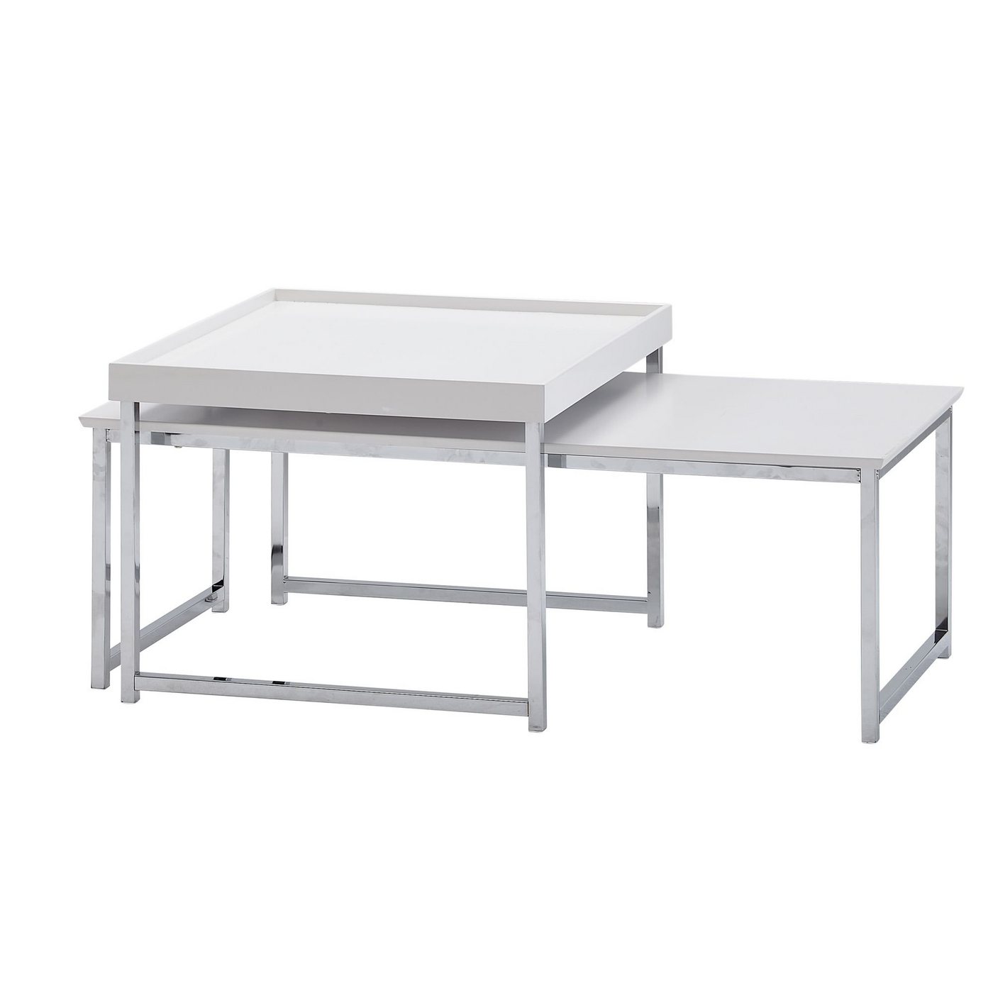 DesignAttraktive Couchtische in modernem DesignTische in unterschiedlichen FormenHarmonische Farbkombination aus Weiß und SilberAbmessungenRechteckiger TischBreite: 110 cmTiefe: 48 cmHöhe: 37 cmTischplattenstärke: 2 cmMaximale Belastbarkeit: 10 kgQuadratischer TischBreite: 60 cmTiefe: 60 cmHöhe: 45 cmTischplattenstärke: 2 cmMaximale Belastbarkeit: 5 kgFarbeTischplatten: WeißGestelle: SilbernBesonderheitenDie Ablageflächen bieten genügend Platz für Getränke, Snacks und FernbedienungenFester Stand dank der robusten Tischgestelle aus MetallKunststoffkappen schützen Ihren Fußboden und das Metall vor unschönen KratzernTische lassen sich platzsparend ineinanderschiebenSowohl im Set als auch einzeln verwendbarMaterialTischplatten: lackiertes MDFGestelle: verchromter StahlLieferumfangZwei Couchtische ohne DekorationMontageanleitung und -material liegen der Lieferung beiMontageLieferzustand: zerlegt und praktisch verpacktPflegehinweiseDie Oberfläche am besten mit einem lauwarmen, leicht angefeuchteten Baumwolltuch abwischen und Restfeuchtigkeit mit einem fusselfreiem Lappen entfernen.
