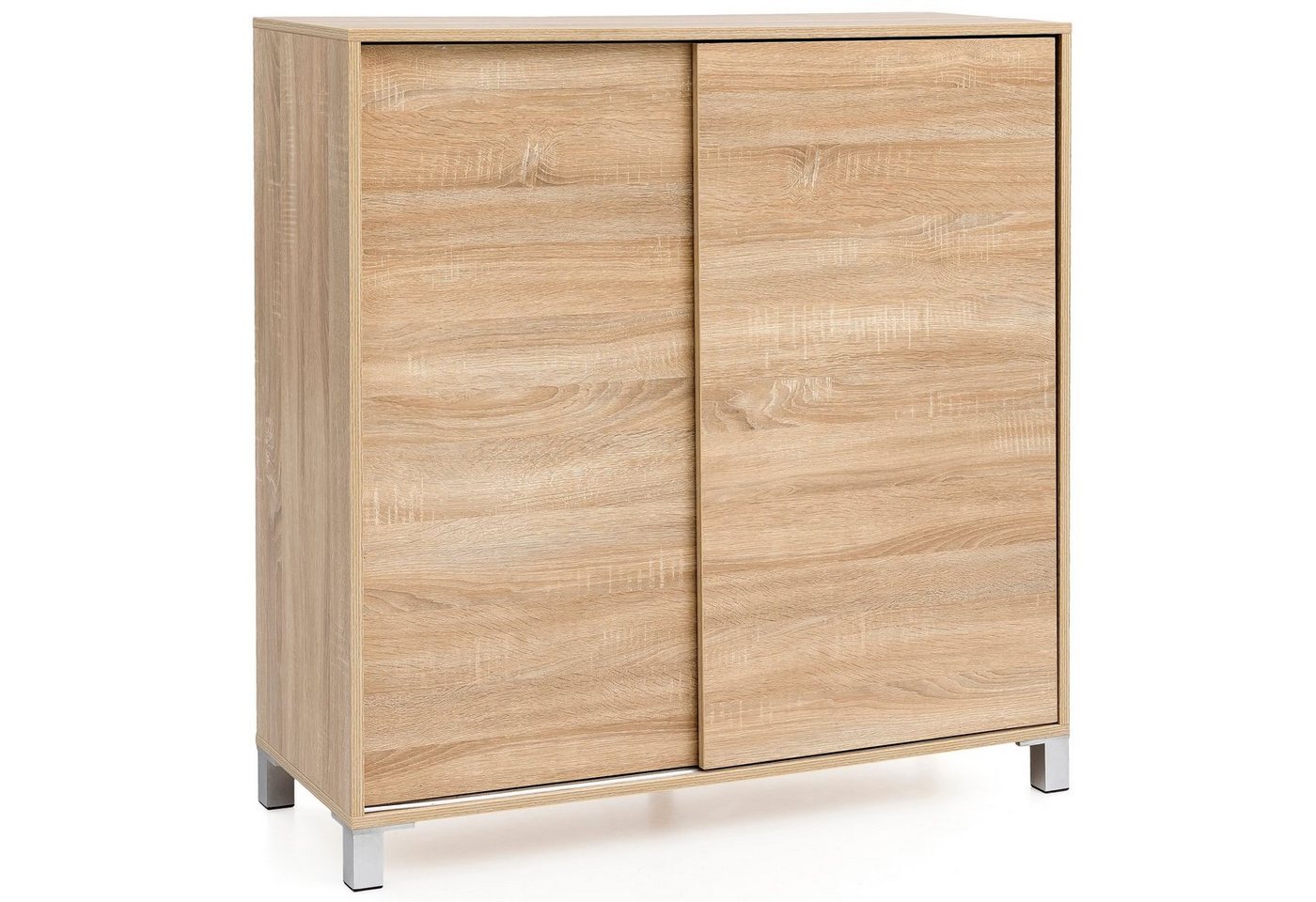 DesignPraktischer Schuhschrank in modernem und zeitlosem DesignEnorm viel Stauraum durch die fünf durchgehenden AblagefächerSchuhe sind durch die beiden Schiebetüren vor Blicken geschütztAbmessungenBreite: 100 cmHöhe: 108 cmTiefe: 37,5 cmInnenabmessungen je Fach (BxHxT): 97 x 19 x 32 cmMaterialstärke: 1,5 cmBodenfreiheit: 8 cmWeitere Abmessungen finden Sie im MaßbildFarbeSonomaBesonderheitenKratzfeste Oberfläche dank der Melaminharz-BeschichtungDurch das Melaminharz ist das Schuhregal zudem wasserabweisendGeeignet für ca. 20 Paar Schuhe (Je nach Schuhgröße – Angabe basiert auf Schuhgröße 42) Durch die Rückwand ist Ihre Hauswand vor Verschmutzungen durch die Schuhe geschütztAnti-Rutsch-Noppen an den Beinen schützen Ihren Fußboden vor KratzernIdeal geeignet für Wohnungen mit wenig Platz in der DieleMaterialFlurschrank: MDFBeine: KunststoffLieferumfangEin Schuhschrank ohne DekorationLeicht verständliche Montageanleitung inklusiveMontageLieferzustand: Praktisch zerlegt und sicher verpacktEinfacher und schneller Aufbau dank gut durchdachter KonstruktionPflegehinweiseDie Oberfläche mit einem lauwarm angefeuchteten Baumwolltuch reinigen. Kein Scheuermittel, scharfe Reinigungsmittel oder tropfnasse Tücher verwenden.
