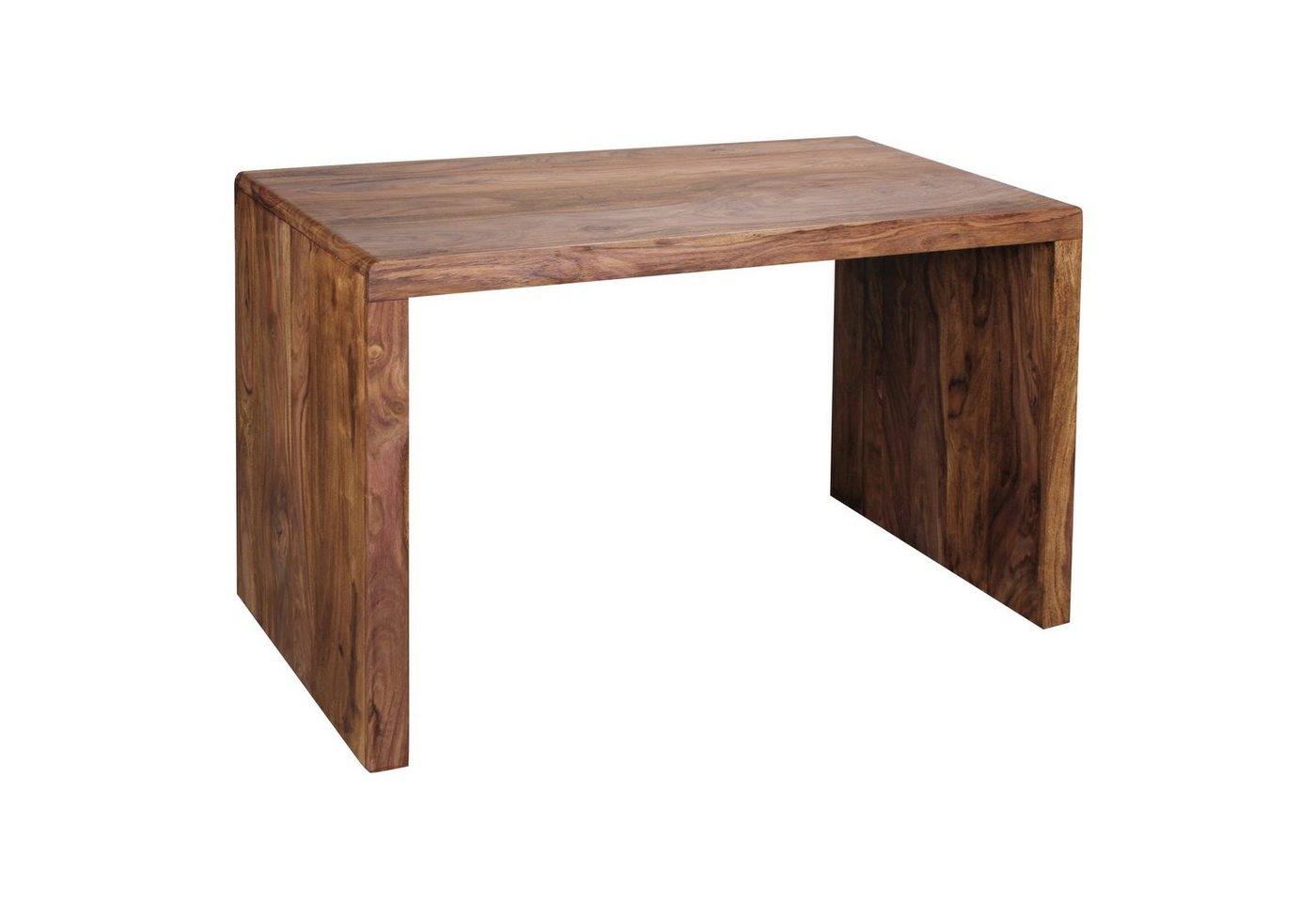 DesignAusdruckstarkes, gemasertes Sheesham MassivholzAusreichend AblagemöglichkeitenAbgerundete EckenMassive Standbeine für perfekte StabilitätSchlichtes DesignAbmessungenHöhe: 76 cmBreite: 120 cmTiefe: 60 cmBoden bis Beginn Tischplatte: 70 cmZwischenraum zwischen den beiden Standbeinen: 108 cmHöhe Tischplatte: ca. 3 cmHöhe Tischplatte mit Seitenblende: ca. 6 cmFarbeSheeshamBesonderheiten:Gefertigt in HandarbeitJeder Tisch ein UnikatLanglebige und pflegeleichte Oberfläche welche bei Bedarf mit Möbelwachs nachbearbeitet werden kannMaterialMassivholz SheeshamDa es sich um Handarbeit und um ein Naturprodukt handelt kann es zu Farbabweichungen oder Unebenheiten kommenLieferumfang1 SchreibtischLieferung ohne Rollcontainer und DekorationMontageLieferzustand: praktisch zerlegt und praktisch verpacktLeicht verständliche Montageanleitung inklusiveEinfacher und schneller Aufbau dank gut durchdachter KonstruktionPflegehinweiseDie Holzoberfläche am besten mit einem lauwarmen, leicht angefeuchteten Baumwolltuch abwischen und Restfeuchtigkeit mit einem fusselfreien Lappen entfernen.