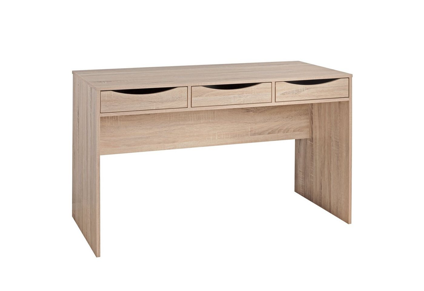 DesignHochwertiges und modernes Design kombiniertPraktische Blende an der Rückseite des Tisches (kein Kabelsalat zu sehen)3 Schubladen mit formschön ausgearbeiteten &, extra breiten Griffmulden2 farbgleiche Seitenwände als StandfüßeAbmessungenHöhe: 75 cmHöhe Boden bis Schubladen: 62 cmBreite: 120 cmTiefe: 55 cmMaße 3 Schubladen innen (BxHxT): 33,5 x 6,5 x 33,5 cmFarbeSonomaBesonderheitenKomplett freie Arbeitsfläche – Schubladen sind unter Tischplatte integriertDie 3 Schubladen sind durch Scharniere ausziehbarAnti-Rutsch Pads an den Fußunterseiten – verhindern unschöne Kratzer am BodenDurch seine schlichte Form und den 3 Schubladen bietet der Tisch genügend Stauraum um Büromaterial und Hefte sauber zu verstauenKombinationen mit diversen Bürostühlen und Lampen sind jederzeit möglich – Der ideale AllrounderMaterialSpanplatteLieferumfang Ein Schreibtisch ohne DekorationMontagematerial und Aufbauanleitung inklusiveMontageLieferzustand: zerlegt und sicher verpacktBauteile sind nummerier, das erleichtert den Aufbau