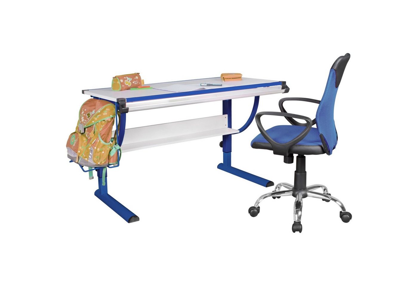Für wen geeignet?Kinder und Jugendliche im Alter von 6-15 Jahren mit einer Größe von 120 – 180 cmDesignCooles Design in blau / weiß, besonders für Jungen geeignetInformation zur Höhen- und NeigungsverstellungDer Tisch ist in 3 cm Schritten von 62 – 94 cm höhenverstellbarDie Tischplatte ist in 10 Stufen bis ca. 70 ° im Neigungswinkel verstellbarMaterialzusammensetzungDer Schreibtisch ist mit einem lackierten Metall C-Fuß-Gestell ausgestattet und bietet dadurch hohe StabilitätDie Tischplatte ist aus Melaminharzbeschichtetem MDF (Mitteldichte Holzfaser)Technische Daten und AbmessungenTischplatte(BxT): 118 x 60 cmGesamtbreite inkl. Schultaschenhalter: 130 cmTischhöhe: Mindesthöhe 62 cm, Maximalhöhe 94 cmMaximalhöhe bei einem Neigungswinkel von ca. 70°: 138 cmAblagefach (BxT): 96 x 14 cmBesonderheitenSchultaschenhalterung kann beidseitig angebracht werdenDer Tisch hat zwei integrierte Lineale, die oben und unten an der Tischplatte angebracht sindUnter der Tischplatte befindet sich ein platzsparendes AblagefachAm vorderen Ende der Platte befindet sich eine halbrund geformte StiftablageHöhe und Neigung können den Bedürfnissen Ihres Kindes angepasst werden und ermöglichen so eine gesunde HaltungGroße, neigbare Tischplatte für uneingeschränktes Lernen, Basteln und MalenLieferumfangEinen Schreibtisch inkl. Schultaschenhalterung, StifthalterungLieferung ohne Dekoration in versandsicherer VerpackungMontageanleitung und -material liegen beiInformation zur MelaminharzbeschichtungDas Kunstharz Melamin ist aufgrund seiner Eigenschaften ein idealer Werkstoff, um Möbel zu beschichten. Es bildet äußerst harte und kratzfeste Oberflächen und ist dabei wasserabweisend, fettfest und hitzebeständig bis 70°C.