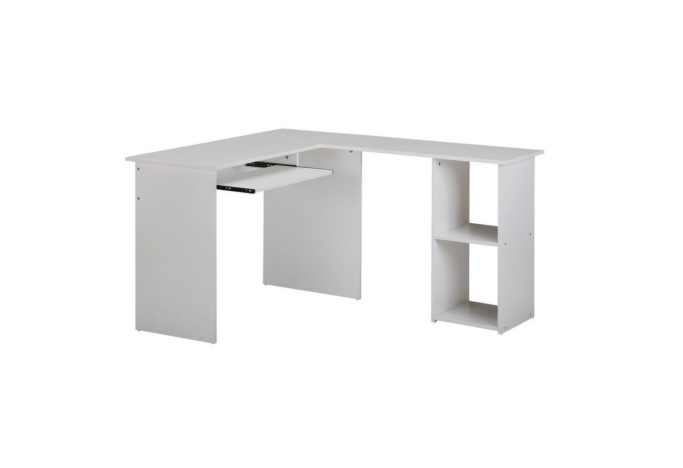 DesignSchreibtischkombination in zeitlosem DesignPraktischer Bürotisch mit integriertem StandregalAusgestattet mit zwei offenen Fächern und einem TastaturauszugAbmessungenBreite: 140 cmHöhe: 75,5 cmTiefe: 120 cmBoden bis Tastaturauszug: ca. 65,5 cmInnenmaße der Regalfächer (BxHxT): 30 x 34,5 x 34,5 cmMaterialstärke: 1,6 cmWeitere Abmessungen finden Sie im MaßbildFarbeWeißBesonderheitenAcht Anti-Rutsch-Noppen schützen Ihren Fußboden vor unschönen KratzernDurch die praktische Höhe der Regalfächer passen Ordner im DIN A4-Format hineinKratzfeste Oberflächen dank der Melaminharz-BeschichtungDurch das Melaminharz ist der Winkelschreibtisch zudem wasserabweisendMaterialTisch und Regal: SpanplatteLieferumfangEine Schreibtischkombination ohne DekorationMontageanleitung und -material liegen der Lieferung beiMontageLieferzustand: praktisch zerlegt und sicher verpacktEinfacher und schneller Aufbau dank gut durchdachter KonstruktionPflegehinweisMit feuchtem Tuch, evtl. mit mildem Reinigungsmittel abwischen, mit trockenem Tuch nachwischen – keine scharfen oder lösungsmittelhaltigen Reiniger verwenden.Information zur MelaminharzbeschichtungDas Kunstharz Melamin ist aufgrund seiner Eigenschaften ein idealer Werkstoff, um Möbel zu beschichten. Es bildet äußerst harte und kratzfeste Oberflächen und ist dabei wasserabweisend, fettfest und hitzebeständig bis 70°C.