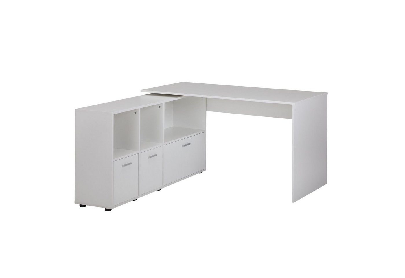 DesignSchreibtischkombination in zeitlosem DesignPraktischer Bürotisch mit integriertem RegalDrei Schubladen befinden sich im offenen SideboardAbmessungenBreite: 136 cmHöhe: 75,5 cmTiefe: 155,5 cmGesamtbreite ausgeklappt: 240 cmBoden bis Tischunterkante: ca. 74 cmInnenmaße Regalfach groß (BxHxT): 66 x 32 x 32,5 cmInnenmaße Regalfächer klein (BxHxT): 32 x 32 x 32,5 cmSchubladeninnenmaße groß (BxHxT): 60 x 28 x 23 cmSchubladeninnenmaße klein (BxHxT): 26 x 28 x 23 cmMaterialstärke: 1,6 cmWeitere Abmessungen finden Sie im MaßbildFarbeKorpus: WeißStandfüße: SchwarzBesonderheitenAcht Standfüße und zusätzliche Anti-Rutsch-Noppen schützen Ihren Fußboden vor unschönen KratzernDurch die praktische Höhe der Regalfächer passen Ordner im DIN A4-Format hineinDas Regal lässt sich drehen – dadurch ist der Bürotisch auch als Eckschreibtisch verwendbarKratzfeste Oberflächen dank der Melaminharz-BeschichtungDurch das Melaminharz ist der Winkelschreibtisch zudem wasserabweisendMaterialTisch und Regal: SpanplatteStandfüße: KunststoffLieferumfangEine Schreibtischkombination ohne DekorationMontageanleitung und -material liegen der Lieferung beiMontageLieferzustand: praktisch zerlegt und sicher verpacktEinfacher und schneller Aufbau dank gut durchdachter KonstruktionPflegehinweisMit feuchtem Tuch, evtl. mit mildem Reinigungsmittel abwischen, mit trockenem Tuch nachwischen – keine scharfen oder lösungsmittelhaltigen Reiniger verwenden.Information zur MelaminharzbeschichtungDas Kunstharz Melamin ist aufgrund seiner Eigenschaften ein idealer Werkstoff, um Möbel zu beschichten. Es bildet äußerst harte und kratzfeste Oberflächen und ist dabei wasserabweisend, fettfest und hitzebeständig bis 70°C.