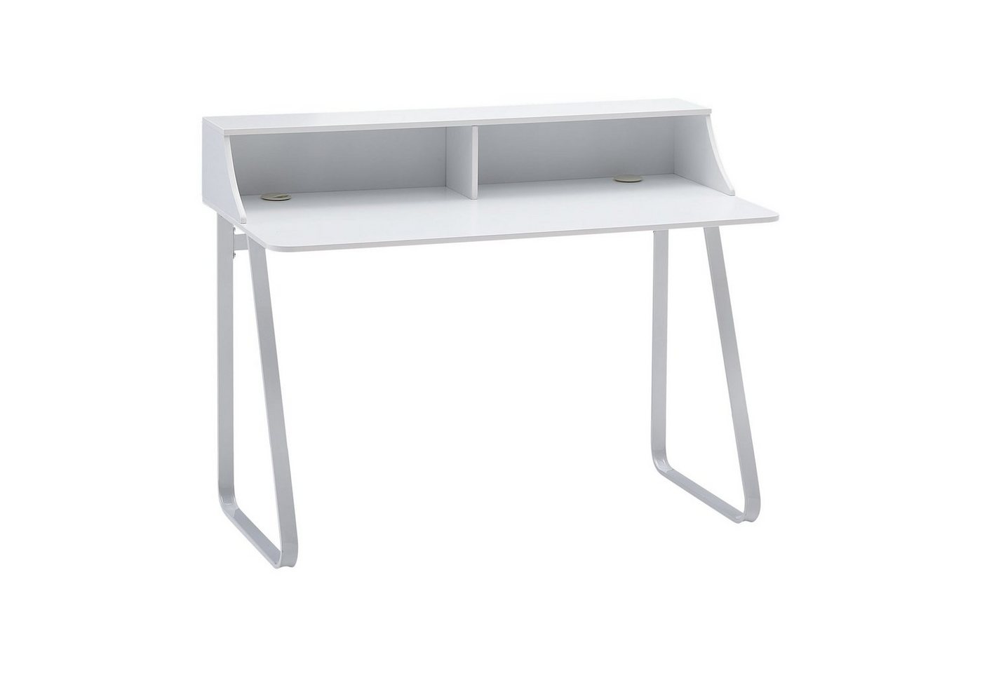 DesignSchreibtisch in schlichtem und linientreuem ErscheinungsbildTischplatte mit Aufsatz und zwei KabeldurchlässenGeschwungene Tischbeine runden das Design gekonnt abAbmessungenBreite: 120 cmTiefe: 60 cmHöhe: 92 cmBoden bis Tischunterkante: 72 cmInnenabmessungen je Regalfach (BxHxT): 58 x 18,5 x 20 cmTischplattenstärke: 1,5 cmFarbeKompletter Tisch: WeißBesonderheitenVielseitig einsetzbar als Schreib-, Arbeits- oder auch SchminktischDie robusten Metallbeine bieten einen sicheren StandMonitor lässt sich bequem auf der Ablage platzierenDurch die Kabeldurchlässe sind Aufladekabel und Co. stets aufgeräumtMinimalistisches Design sorgt für wenig AblenkungEmpfohlene Maximalbelastbarkeit: 10 kgMaterialTischplatte: MDF, weiß lackiertBeine: lackierter StahlLieferumfangEin Schreibtisch ohne DekorationMontageanleitung und -material inklusiveMontageLieferzustand: demontiert und sicher verpacktPflegehinweisMit einem feuchten Tuch, evtl. mit mildem Reinigungsmittel abwischen und mit einem trockenen Tuch nachwischen – keine scharfen oder lösungsmittelhaltigen Reiniger verwenden.