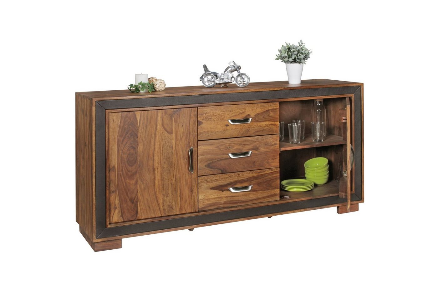 DesignGroße Kommode im rustikalen LandhausstilKonsole mit drei Schubladen und vier StauraumfächernKunstlederapplikation umrandet die Front des SideboardsAbmessungenBreite: 160 cmHöhe: 80 cmTiefe: 44 cmInnenmaß der Schubladen BxHxT: 40,5 x 16 x 34,5 cmWeitere Maße, siehe MaßbildFarbeSideboard ist braun mit schöner Sheesham MaserungKunstlederapplikation ist schwarzBesonderheitenGeräumige Schubladen zur Unterbringung von UtensilienGroße Ablage für Dekoration und andere GegenständeStauraumfächer werden durch je eine Tür verdecktMaterialSheesham Massivholz – mit PU-Schutzlack versiegelten OberflächenDekorative Applikation aus KunstlederTextilzusammensetzungDekorstreifen: 100% PolyurethanLieferumfangEine Kommode ohne DekorationMontageLieferzustand: MontiertPflegehinweisMit feuchtem Tuch, evtl. mit mildem Reinigungsmittel abwischen, mit trockenem Tuch nachwischen – keine scharfen oder lösungsmittelhaltigen Reiniger verwenden.