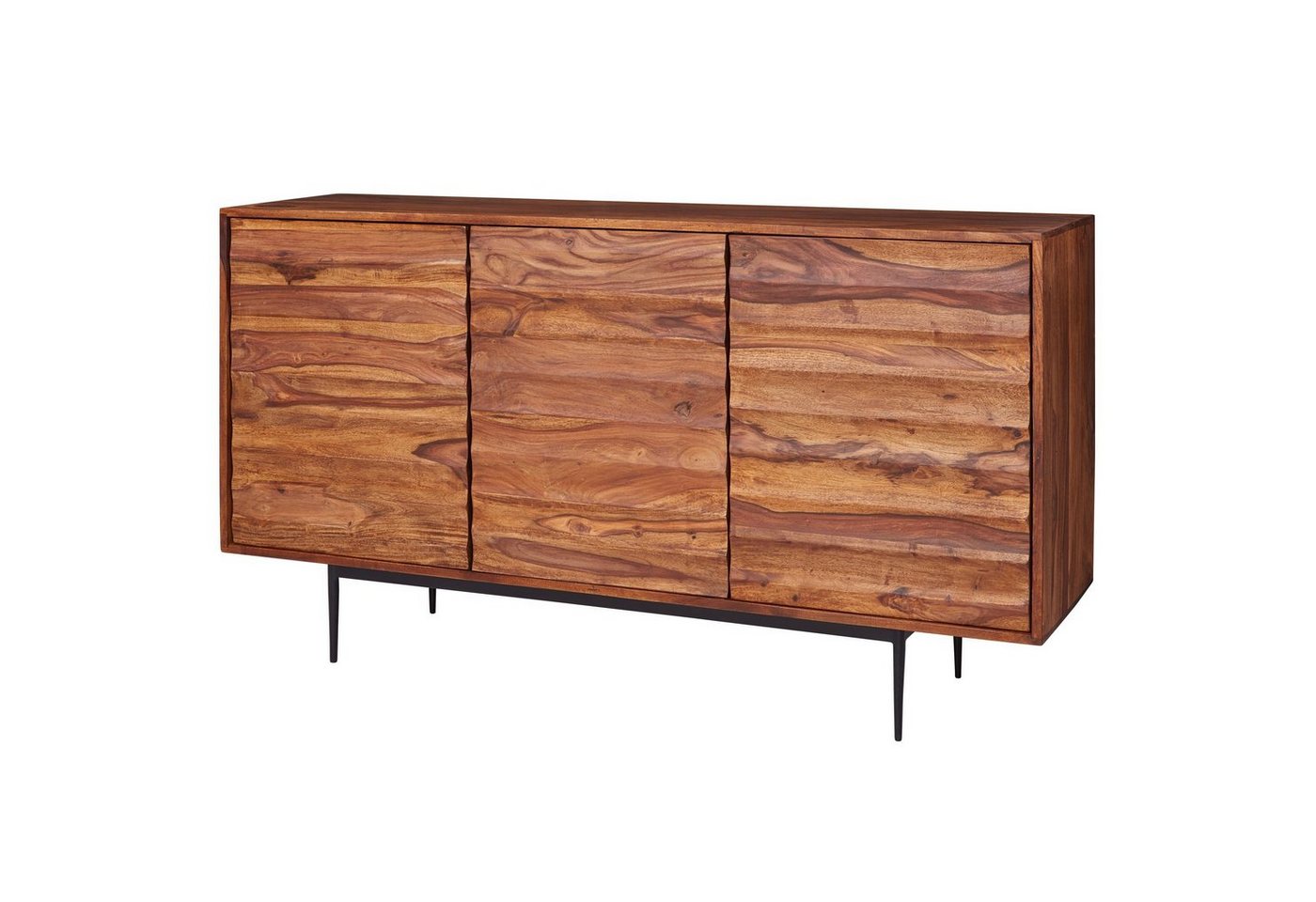 DesignBewundernswertes Sideboard im angesagten Industrial-StilDie Holzlamellen sorgen für eine außergewöhnliche AbwechslungDrei geräumige Türfächer sorgen für viel StauraumStimmiger Materialmix aus Holz und MetallAbmessungenBreite: 150 cmHöhe: 81 cmTiefe: 41 cmInnenmaße Türfach innen (BxHxT): 47 x 59 x 36 cmInnenmaße je Türfach aussen (BxHxT): 37 / 47 x 59 x 36 cmHöhe des Einlegebodens: 28,5 cmBodenfreiheit: 18 cmWeitere Abmessungen finden Sie im MaßbildFarbeKorpus: BraunBeine: SchwarzBesonderheitenPush to Open Funktion für ein leichteres öffnen der TürenDie Einlegeböden sind fest in den Türfächern eingebautJede Anrichte wurde in liebevoller Handarbeit gefertigt und ist daher ein absolutes UnikatAufgrund des Designs kann das Sideboard in vielen Räumen eingesetzt werden (z.B. Flur, Wohnzimmer…)MaterialKorpus: Sheesham MassivholzBeine: Pulverbeschichteter StahlLieferumfangEin Sideboard ohne DekorationMontageLieferzustand: montiert, kein Aufbau nötigPflegehinweiseDie Oberfläche mit einem lauwarm angefeuchteten Baumwolltuch reinigen. Kein Scheuermittel, scharfe Reinigungsmittel oder tropfnasse Tücher verwenden.