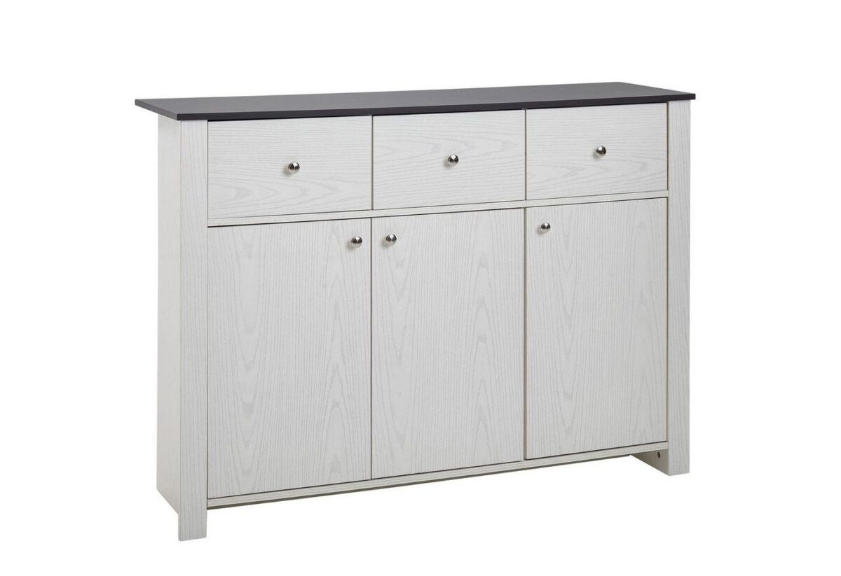 DesignStilvolle Schubladenkommode in modernem DesignDrei Schubladen und vier Türfächer sorgen für StauraumFarblich abgesetzte Ablagefläche für Fotos und DekorationAusdrucksstarkes und elegantes BirkendekorAbmessungenBreite: 128 cmHöhe: 94 cmTiefe: 40 cmInnenabmessungen je Schublade (BxHxT): 34,5 x 12 x 34 cmInnenabmessungen große Türfächer (BxHxT): 70 x 29,5 x 37 cmInnenabmessungen kleine Türfächer (BxHxT): 37,5 x 29,5 x 37 cmMaterialstärke: 1,5 cmWeitere Abmessungen finden Sie im MaßbildFarbeAblagefläche: SchwarzKorpus: WeißGriffe: SilbernBesonderheitenDrei geräumige Schubladen um diverse Gegenstände unterzubringenFest verbaute Einlegeböden hinter den TürenKratzfeste Oberfläche dank der MelaminharzbeschichtungDurch das Melamin ist die Kommode zudem wasserabweisendAnti-Rutsch-Noppen schützen Ihren Fußboden und das Sideboard vor KratzernMaximalbelastbarkeit (inkl. Schubladen): 40 kgMaterialKorpus: folierte Spanplatte mit MelaminharzbeschichtungGriffe: AluminiumScharniere: MetallLieferumfangEin Sideboard ohne DekorationMontageanleitung und -material inklusiveMontageLieferzustand: zerlegt und sicher verpacktEinfacher und schneller Aufbau dank gut durchdachter KonstruktionPflegehinweisMit feuchtem Tuch, evtl. mit mildem Reinigungsmittel, abwischen &, mit trockenem Tuch nachwischen – keine scharfen oder lösungsmittelhaltigen Reiniger verwenden.