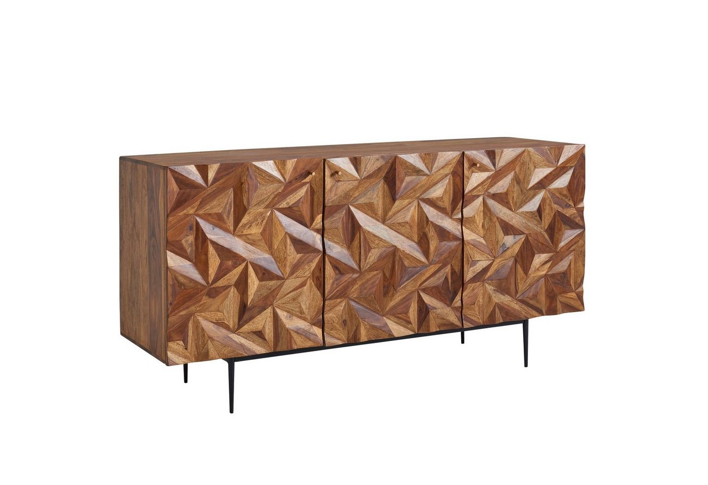 DesignStilvolles Sideboard in modernem DesignInsgesamt vier Türfächer sorgen für StauraumAufregende 3D-Oberflächengestaltung der TürfrontenAusdrucksstarke und natürliche HolzmaserungFester Stand dank des robusten MetallgestellsAbmessungenBreite: 144 cmHöhe: 72 cmTiefe: 47 cmInnenmaße je kleinem Türfach (BxHxT): 45 x 25 x 36 cmInnenmaße je großem Türfach (BxHxT): 92 x 25 x 36 cmBodenfreiheit: 15 cmMaterialstärke Holz: 1,5 cmWeitere Abmessungen finden Sie im MaßbildFarbeKorpus und Griffe: BraunGestell: SchwarzBesonderheitenDie Türfächer bieten Ihnen viel Platz für die Unterbringung unterschiedlichster DingeJede Anrichte wurde in liebevoller Handarbeit gefertigt und ist daher ein absolutes UnikatHolzschutz bietet die Schutzlackversiegelung der HolzoberflächenAufgrund des Designs kann das Sideboard in vielen Räumen eingesetzt werden (z.B. Küche, Wohnzimmer…)Die Einlegeböden sind fest im Sideboard integriertEmpfohlene Maximalbelastbarkeit: 80 kgMaterialKorpus und Griffe: Sheesham Massivholz, mit Klarlack beschichtetRückwand: MDFUntergestell: schwarz pulverbeschichteter EdelstahlLieferumfangEin Sideboard ohne DekorationMontageanleitung und -material liegen der Lieferung beiMontageLieferzustand: teilmontiert, lediglich die Beine müssen angebracht werdenPflegehinweiseDie Oberfläche mit einem lauwarm angefeuchteten Baumwolltuch reinigen. Kein Scheuermittel, scharfe Reinigungsmittel oder tropfnasse Tücher verwenden.