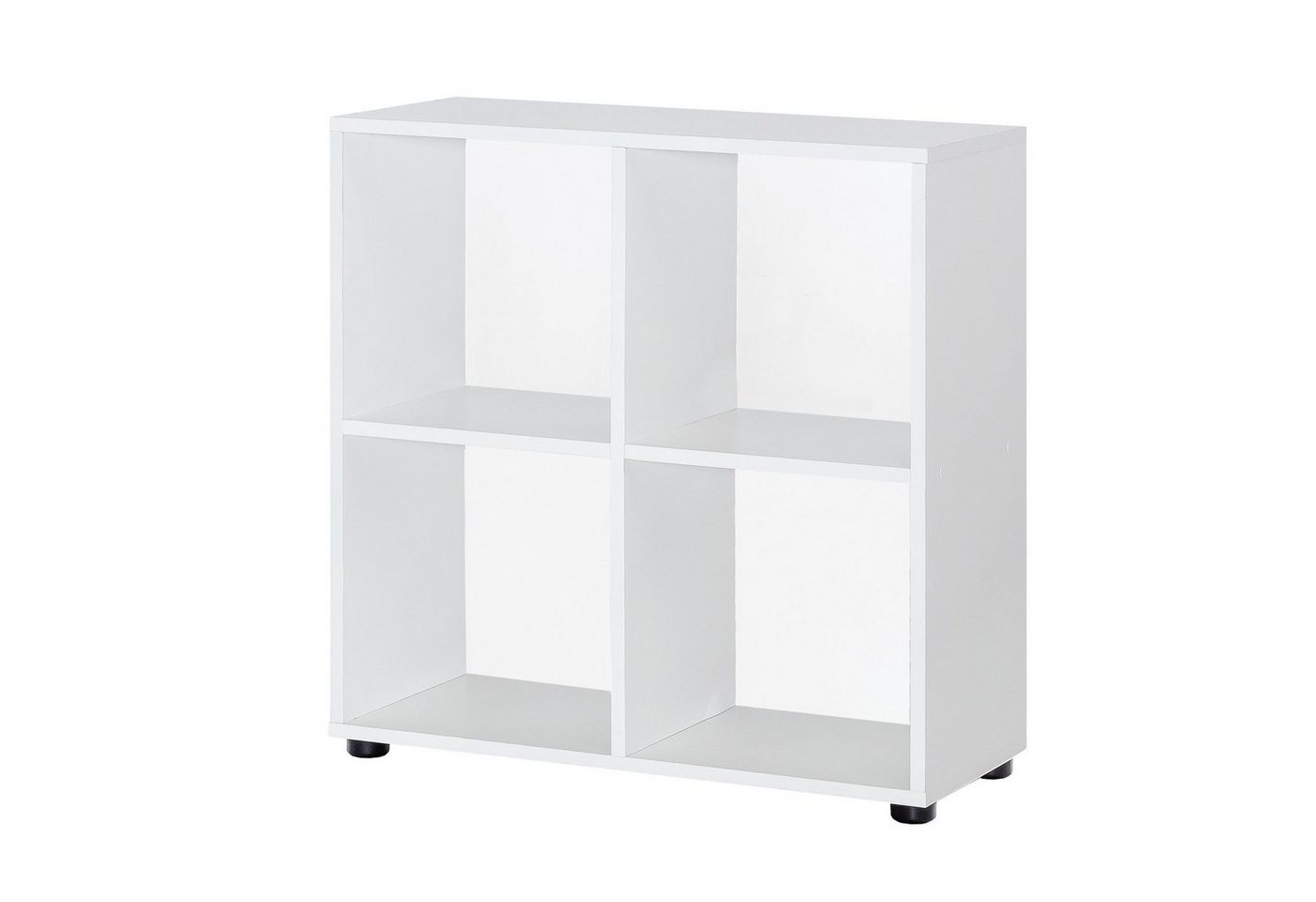 DesignModernes Bücherregal in zeitlosem DesignSchlichtes Wohnregal mit vier RegalfächernViele Ablagemöglichkeiten durch insgesamt 5 AblagenAbmessungenBreite: 70 cmHöhe: 72 cmTiefe: 29 cmFüße: 2,5 cmInnenmaß der Regale B x H x T: 32,5 x 32,5 x 29 cmFarbeKomplettes Regal: WeißStandfüße: Schwarz (matt)BesonderheitenRegal kann beidseitig verwendet werdenViele Fächer bieten zusätzlichen StauraumKratzfeste und wasserabweisende Oberfläche dank der MelaminharzbeschichtungMaterialKomplettes Regal: Spanplatte (melaminharzbeschichtet)Füße: PlastikInformation zur MelaminharzbeschichtungDas Kunstharz Melamin ist aufgrund seiner Eigenschaften ein idealer Werkstoff um Möbel zu beschichten. Es bildet äußerst harte und kratzfeste Oberflächen und ist dabei wasserabweisend und fettfest.PflegehinweiseMit feuchtem Tuch, evtl. mit mildem Reinigungsmittel abwischen, mit trockenem Tuch nachwischen. Keine scharfen oder lösungsmittelhaltigen Reiniger verwenden.LieferumfangEin Bücherregal ohne Dekoration // Montageanleitung und -materialMontageLieferzustand: Zerlegt und praktisch verpackt // einfacher und schneller Aufbau dank gut durchdachter Konstruktion