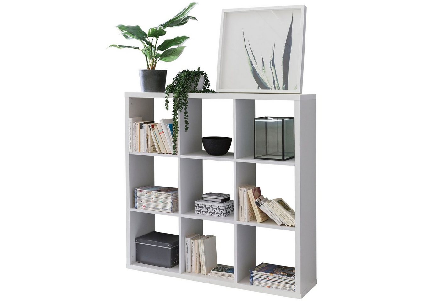 DesignModernes Bücherregal in zeitlosem DesignSchlichtes Wohnregal mit neun RegalfächernZahlreiche Ablagemöglichkeiten aufgrund der Fächer und der AblageflächeAbmessungenBreite: 112 cmHöhe: 112 cmTiefe: 29 cmRegalinnenmaß B x H x T: 34,5 x 34,5 x 29 cmFarbeKomplettes Regal: WeißBesonderheitenStandregal kann als Raumtrenner genutzt werdenKratzfeste, wasserabweisende Oberfläche dank der Melaminharz-BeschichtungRegal kann auf beiden Seiten verwendet werdenViele Regalfächer bieten großzügigen Stauraum für z. B. BücherMaterialKomplettes Regal: Spanplatte (melaminharzbeschichtet)Information zur MelaminharzbeschichtungDas Kunstharz Melamin ist aufgrund seiner Eigenschaften ein idealer Werkstoff um Möbel zu beschichten. Es bildet äußerst harte und kratzfeste Oberflächen und ist dabei wasserabweisend und fettfest.PflegehinweiseMit feuchtem Tuch, evtl. mit mildem Reinigungsmittel abwischen, mit trockenem Tuch nachwischen. Keine scharfen oder lösungsmittelhaltigen Reiniger verwenden.LieferumfangEin Bücherregal ohne Dekoration // Montageanleitung und -materialMontageLieferzustand: Zerlegt und praktisch verpackt // einfacher und schneller Aufbau dank gut durchdachter Konstruktion