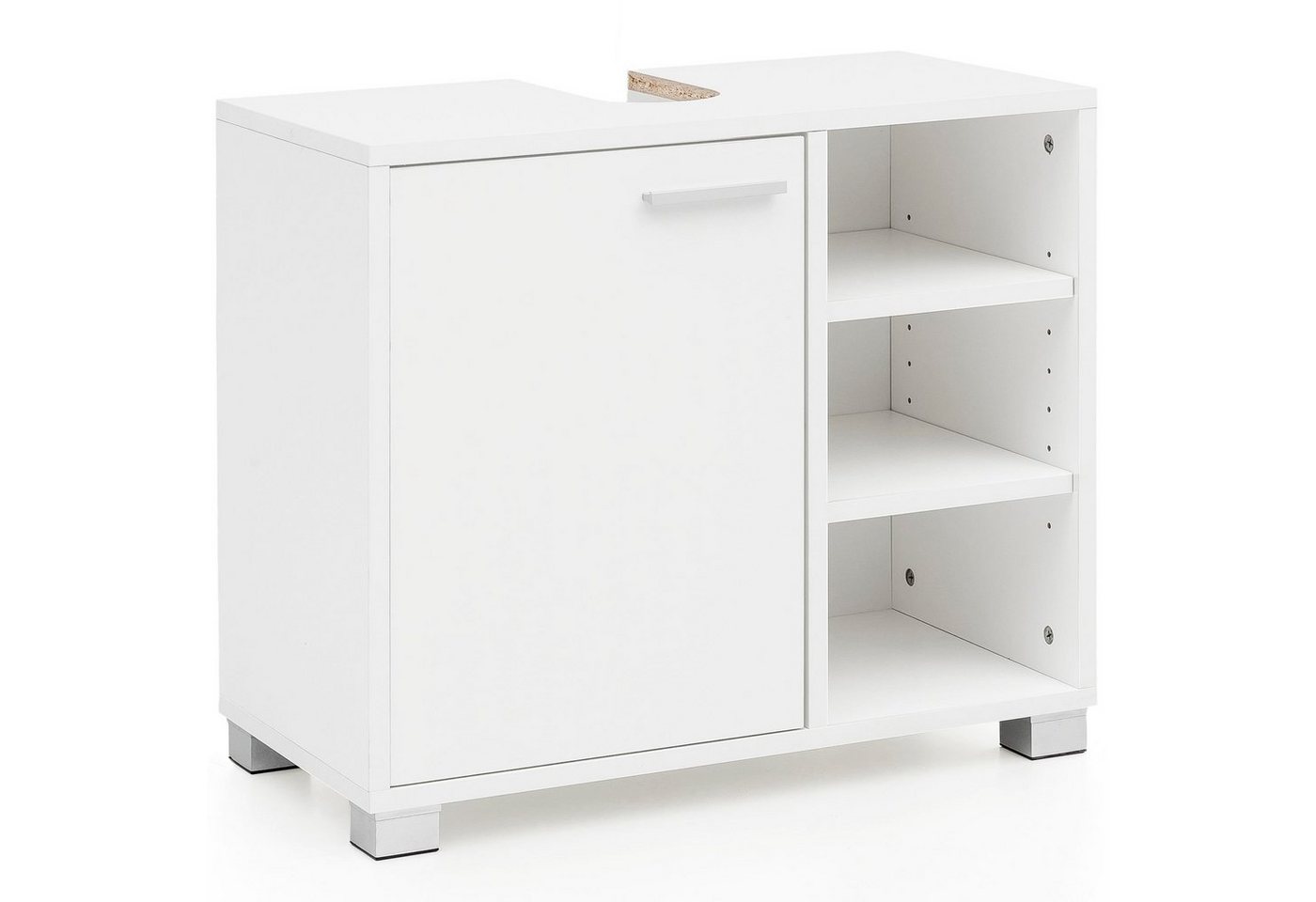 DesignModernes und zeitloses DesignEine Tür und 3 Fächer für viel StauraumEleganter Griff und praktische Standfüße in Aluminium-OptikAbmessungenBreite: 60 cmHöhe: 55 cmTiefe: 32 cmTür: 47 x 33 cmBodenfreiheit: 4 cmSiphon Aussparung (B x T): 21 x 10 cmMaterialstärke Einlegeböden: 1,5 cmWeitere Abmessungen finden Sie im MaßbildBesonderheitenMit Siphonausschnitt – passend für alle handelsüblichen WaschbeckenKratzfeste und wasserabweisende Oberfläche dank der Melaminharz-BeschichtungPflegehinweisMit feuchtem Tuch abwischen, mit trockenem Tuch nachwischen. Bei Bedarf milden Reiniger verwenden. Bitte verzichten Sie auf scharfe und lösungsmittelhaltige Mittel.FarbeKorpus: WeißGriff und Füße: SilberMaterialSpanplatte mit Melaminharz-BeschichtungGriffe und Füße: AluminiumLieferumfangEin Unterschrank ohne DekorationAufbauanleitung und Montagematerial inkl.MontageEinfacher und schneller Aufbau dank gut durchdachter Konstruktion