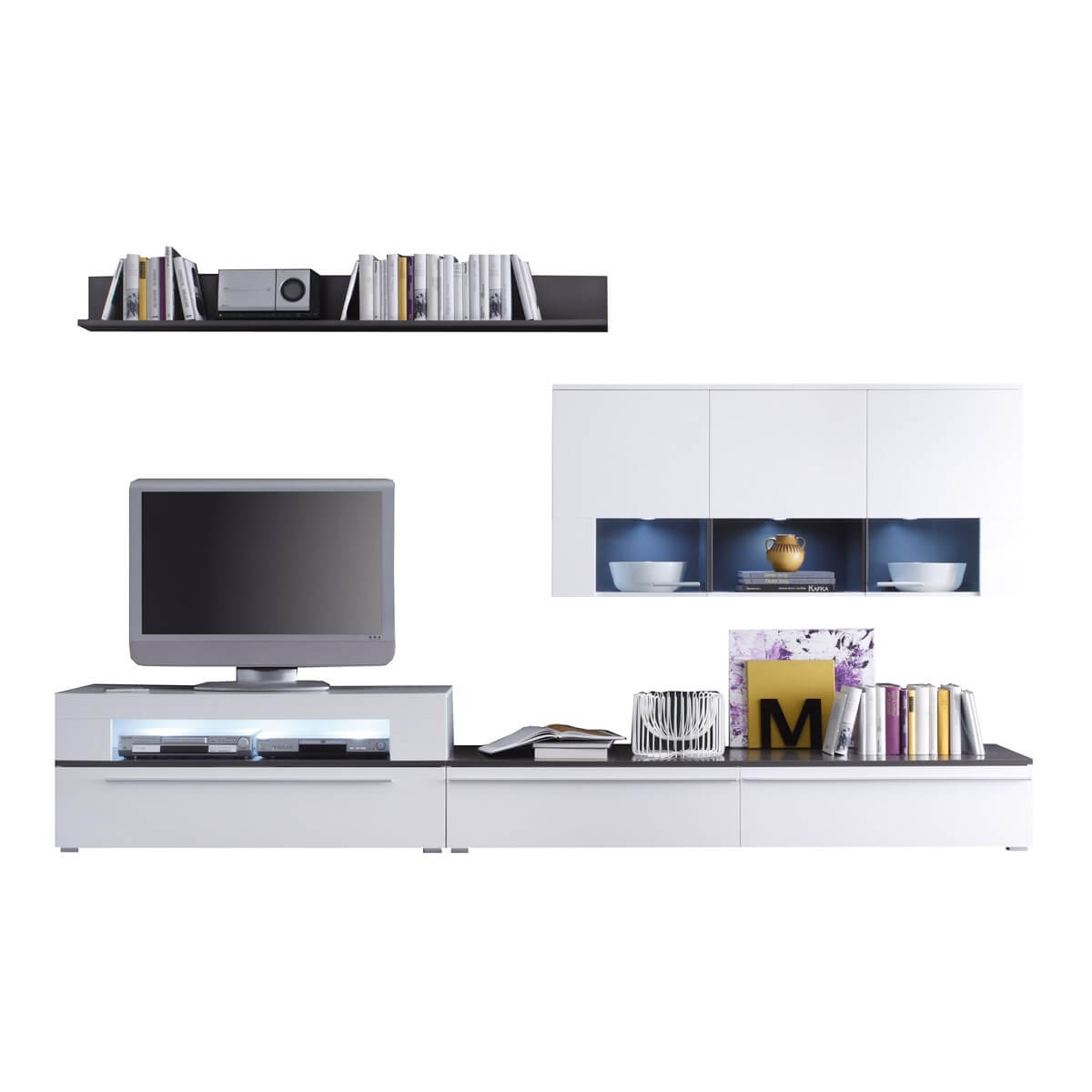 Wohnwand in Weiß und Anthrazit mit Glas inkl. Beleuchtung