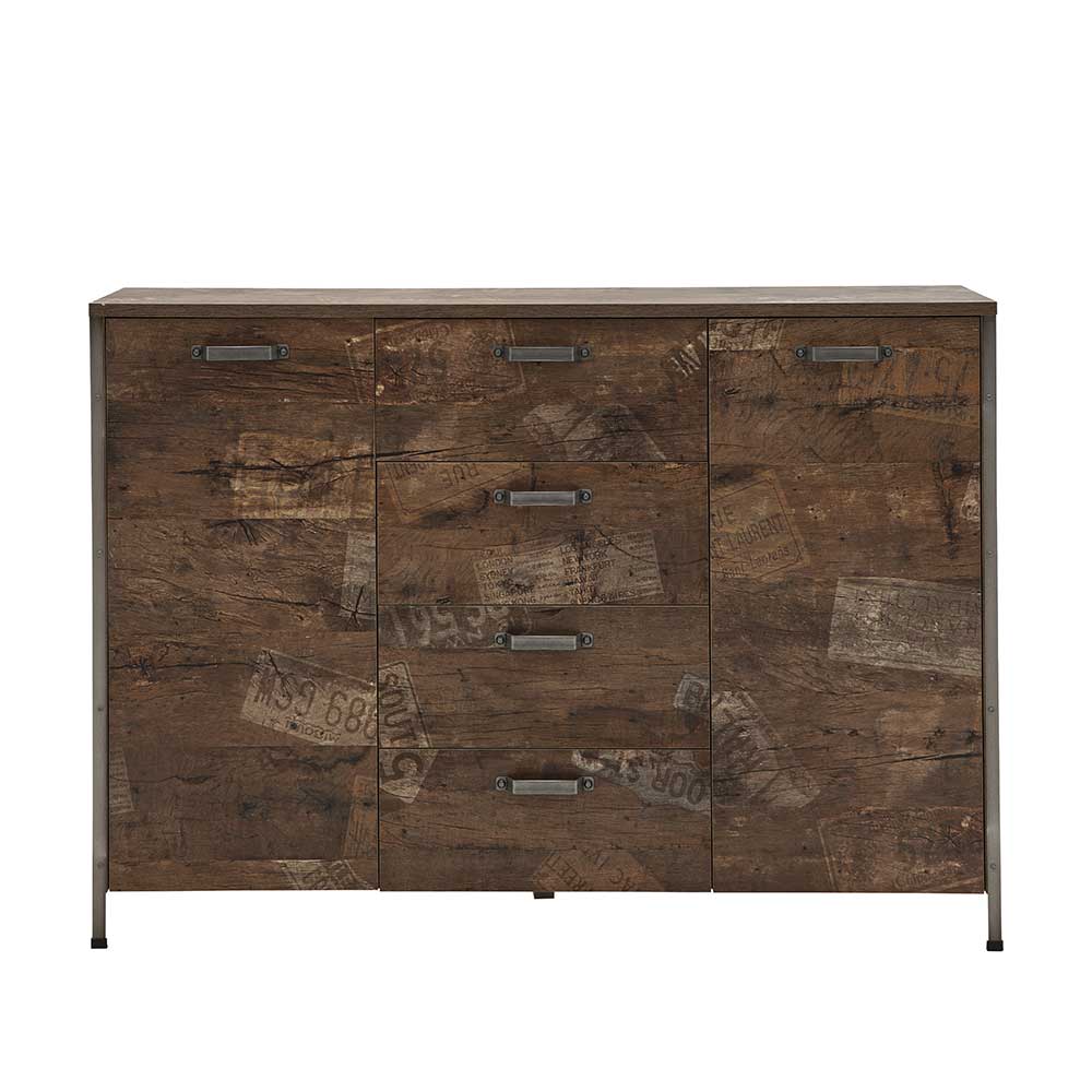 – Sideboard Eiche dunkel – Highboard Metall und Spanplatte – Wohnzimmerschrank Industry & Loft – Anrichte Breite: 168 – Kommode Höhe: 119 – Sidebord Tiefe: 34 – Esszimmerschrank Mit vier Schubladen, mit Metallauszug, mit Soft Close und mit Selbsteinzug – Küchenkommode Schrank-Tür: mit Drehtüren – Wohnzimmer schrank 2-türig (mit Türdämpfung), Innenaufteilung: mit Einlegeböden – Wohnzimmer kommode Ohne Beleuchtung – Highbord Zerlegt, zum leichten Selbstaufbau (Montageanleitung liegt bei) – Anrichte buffet Deutsche Produktion – Große kommode 4-Fuß Gestell aus Metall – Esszimmer kommode Melaminbeschichtet und Touchwood (fühlbare Holzstruktur) – Wohnzimmer highboard Metallgriffen – Wohnzimmerkommode Korpus-Kanten mit Metall Umrandung – Esszimmer highboard Rechteckige Form – Esszimmerkommode Holzpaletten Optik – Anrichte esszimmer Holzwerkstoff Tür – Kommode anrichte Griff Form: BügelgriffInformationen zur Lieferung:Der Versand dieses Artikels erfolgt per DHL Paketdienst (Deutsche Post). Sollten Sie bei der Erstzustellung nicht angetroffen werden, hinterläßt der Zusteller in Ihrem Briefkasten eine Benachrichtigungskarte. Sie können die Ware dann in Ihrer Postfiliale vor Ort abholen. Die Auslieferung erfolgt von Montags bis Samstags. Eine Zustellung an Sonn- und Feiertagen ist nicht möglich.