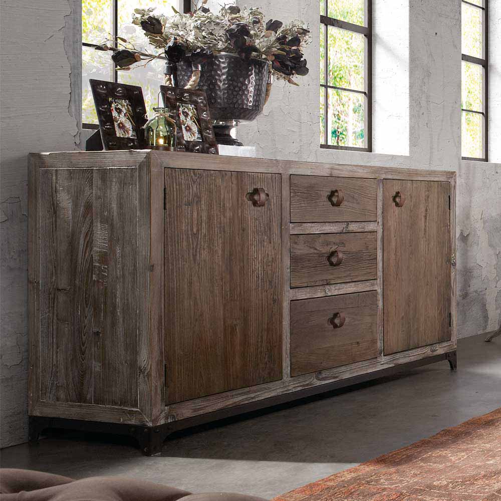 – Sideboard Braun – Wohnzimmerschrank Kiefer Massivholz – Kommode Shabby Chic – Sidebord Breite: 168 – Küchenkommode Höhe: 92 – Kommode holz Tiefe: 48 – Kommode massivholz Mit drei Schubladen und mit Holzauszug – Wohnzimmer schrank Ausergewöhnliches Design – Wohnzimmer kommode Schrank-Tür: mit Drehtüren – Kommode massiv 2-türig, Innenaufteilung: mit Einlegeböden – Kommode echtholz Ohne Beleuchtung – Große kommode Fertig montierte Anlieferung (eventuell müssen noch Kleinteile angebracht werden) – Echtholz kommode 4-Fuß Gestell aus Metall – Kommode vollholz Massivholz Oberfläche und Grey Wash – Esszimmer kommode Rechteckige Form – Massivholzkommode Massivholz Tür