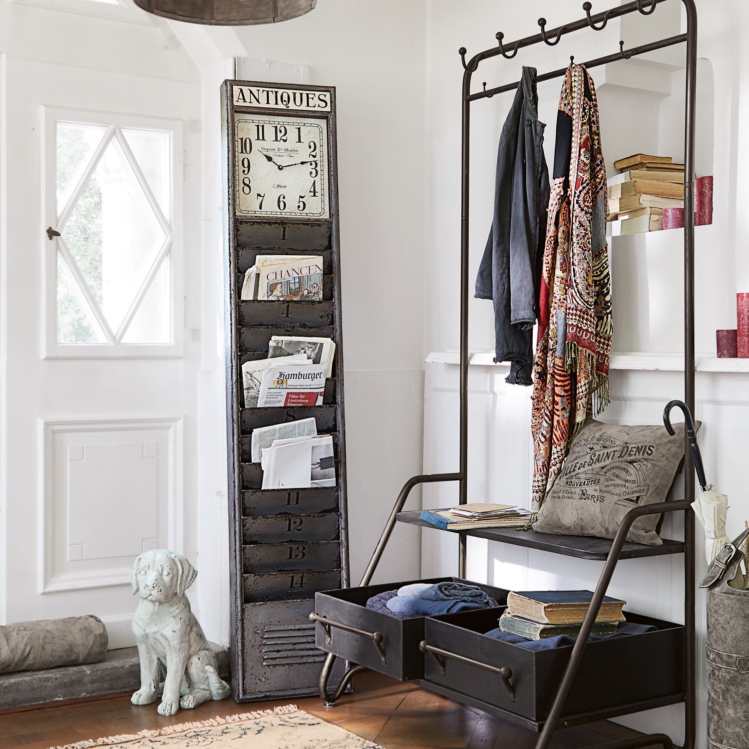 Wand-Objekt mit zwei praktischen Funktionen: Mit Uhr und 14 Fächern für Zeitungen etc. Das multifunktionale Wand-Objekt aus Eisen im Antik-Stil könnte so auch in […]
